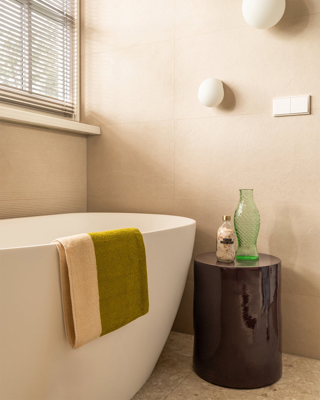 Wat een prachtige lichte badkamer is dit geworden. De warme koperen kranen sluiten perfect aan bij de zachte uitstraling van de verschillende tegels. Het grote raam boven het vrijstaande bad maakt de ruimte tenslotte helemaal af en transformeert het tot een echte droombadkamer.