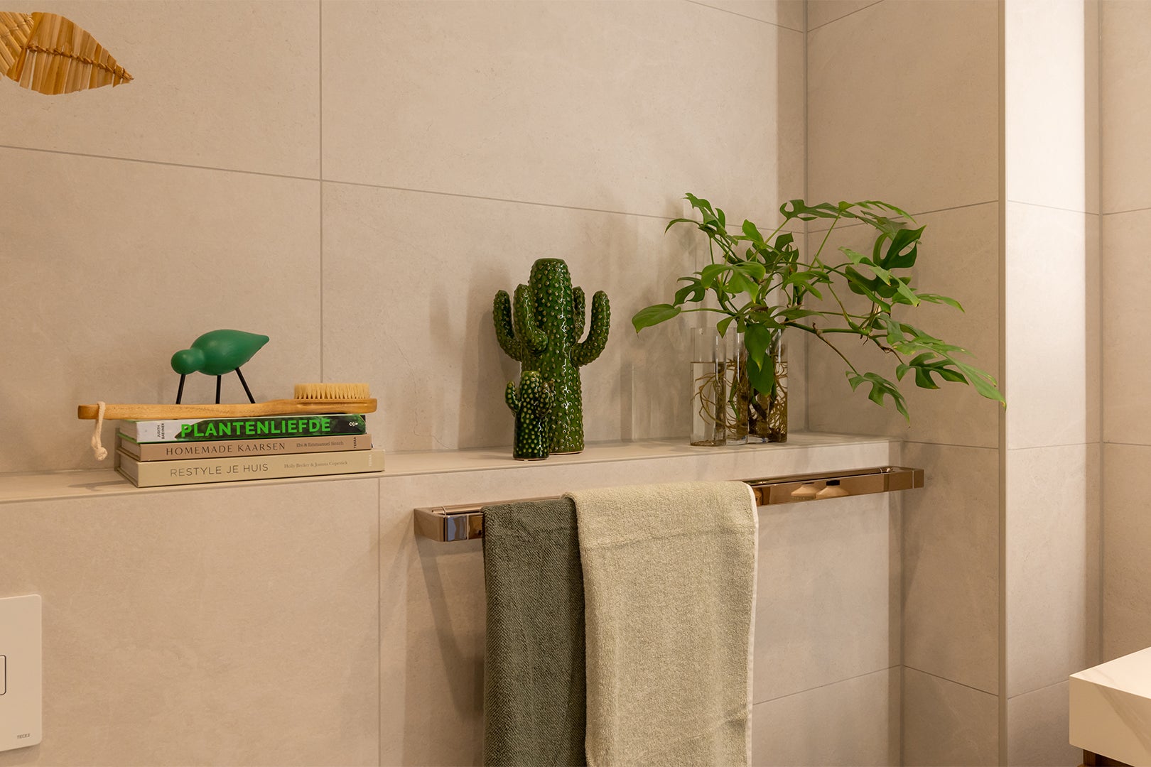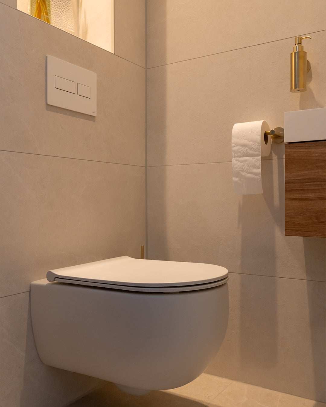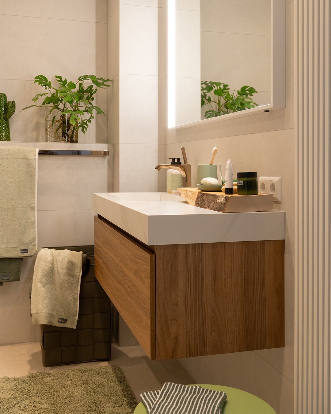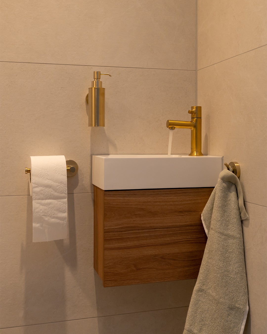 Stap binnen in een oase van warmte, sfeer, rust en comfort. De grote tegels op de wand in een zandkleurige uitstraling zorgen voor die rust en warmte. Combineer dit met een meubel in een chique sfeervolle houtlook met sprekende koperen kranen en je maakt het plaatje helemaal compleet.