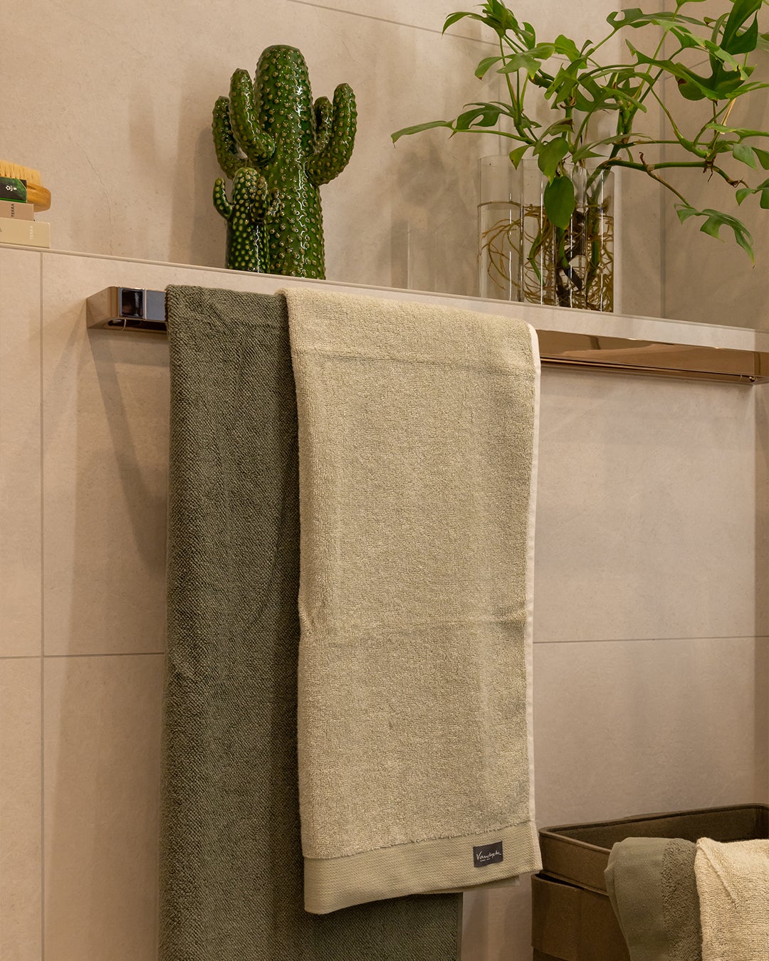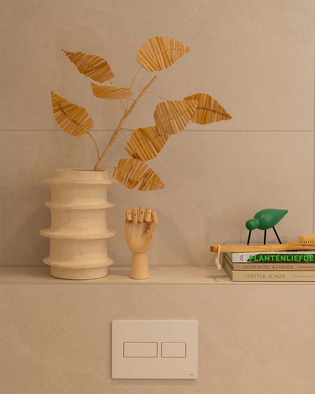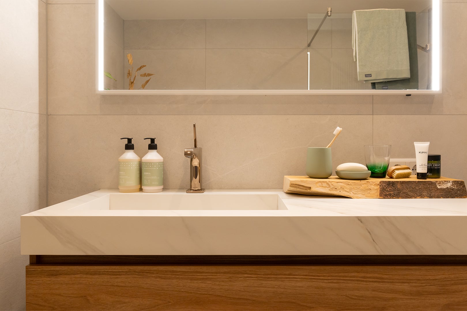 Stap binnen in een oase van warmte, sfeer, rust en comfort. De grote tegels op de wand in een zandkleurige uitstraling zorgen voor die rust en warmte. Combineer dit met een meubel in een chique sfeervolle houtlook met sprekende koperen kranen en je maakt het plaatje helemaal compleet.