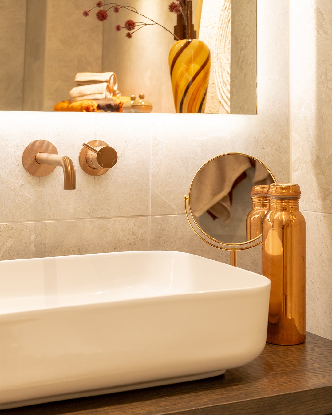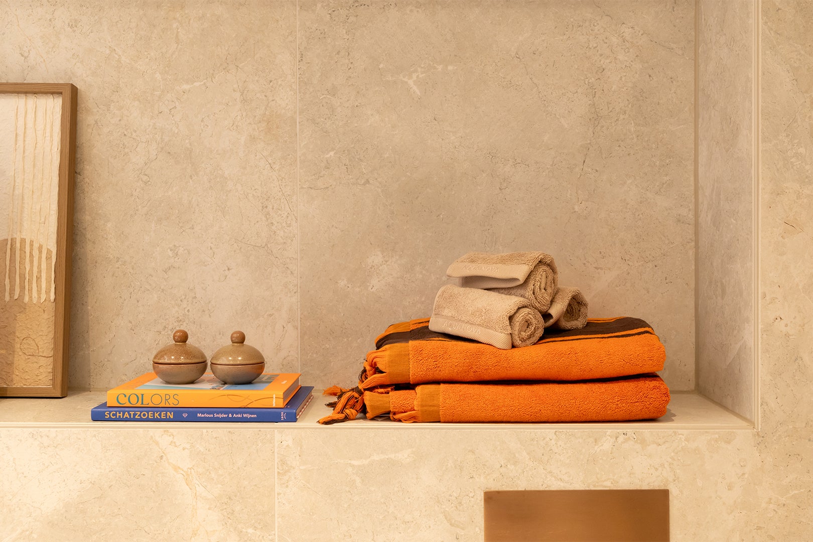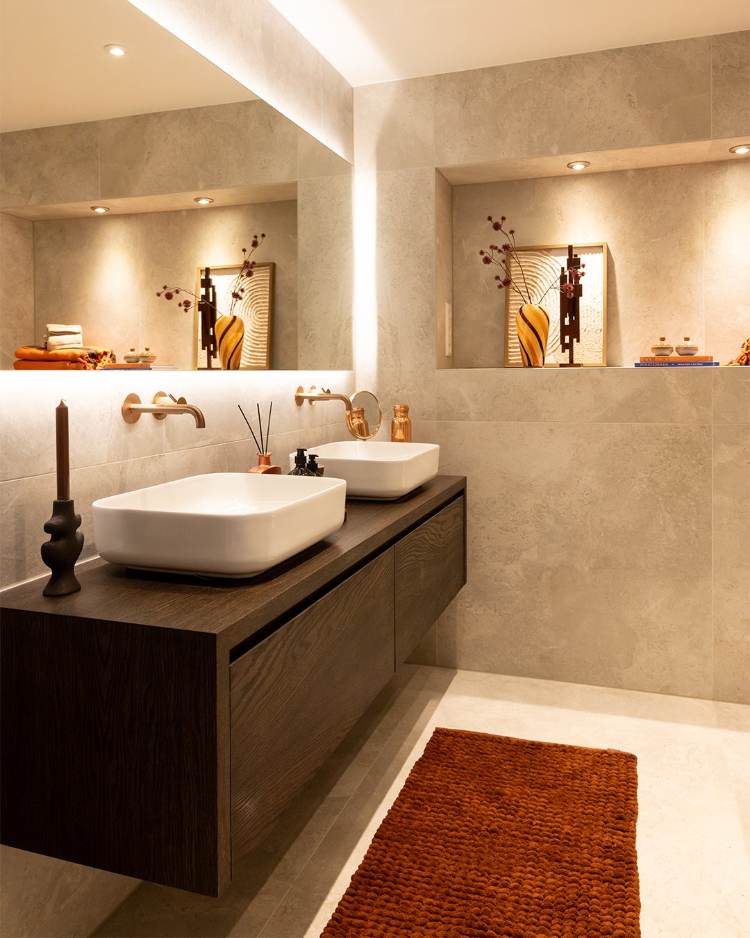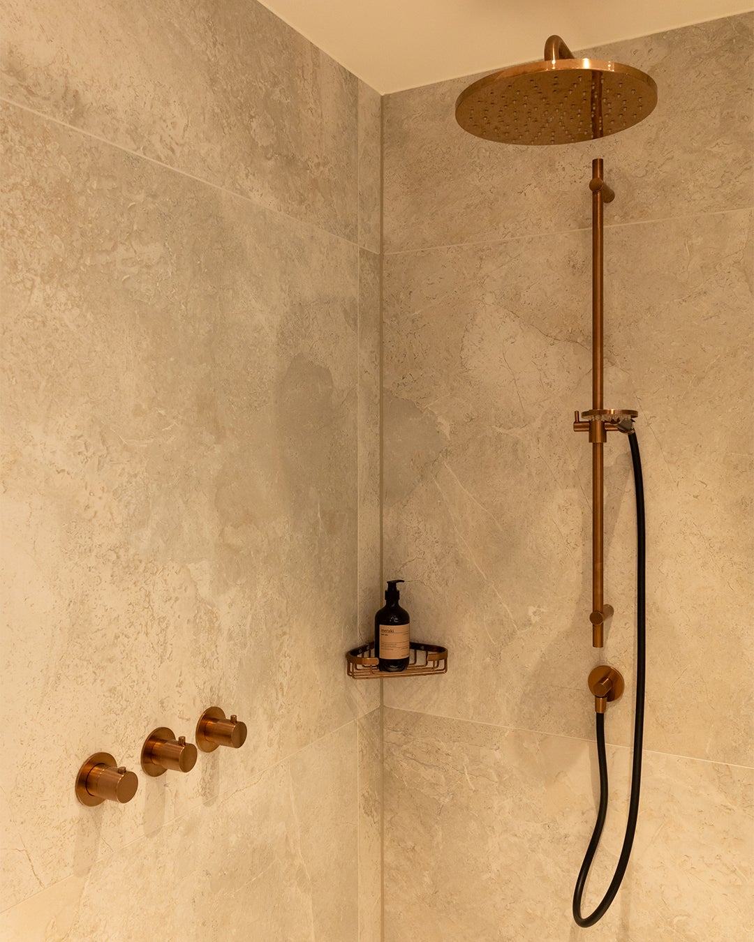 Deze warme tijdloze badkamer is voorzien van een inloopdouche, inbouwspotjes en een ruime nis om decoratie en handdoeken kwijt te kunnen. De opzetkommen op het donkere meubel en de koperen inbouwkranen zorgen samen met de inbouw regendouche voor een luxe en comfortabele wellness ervaring.