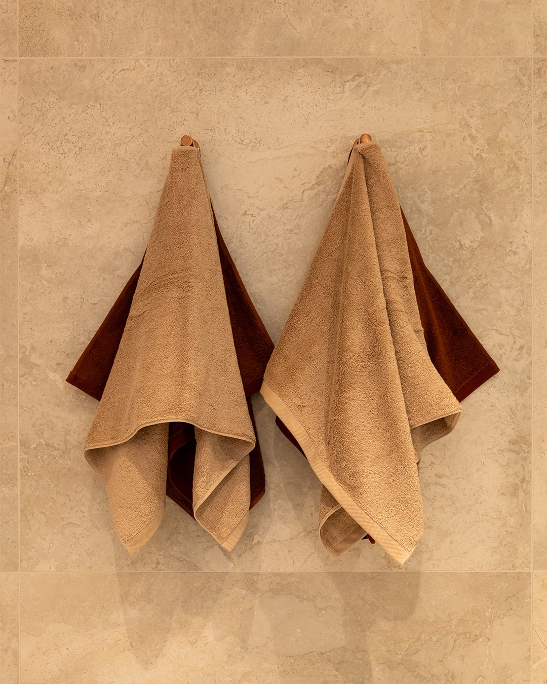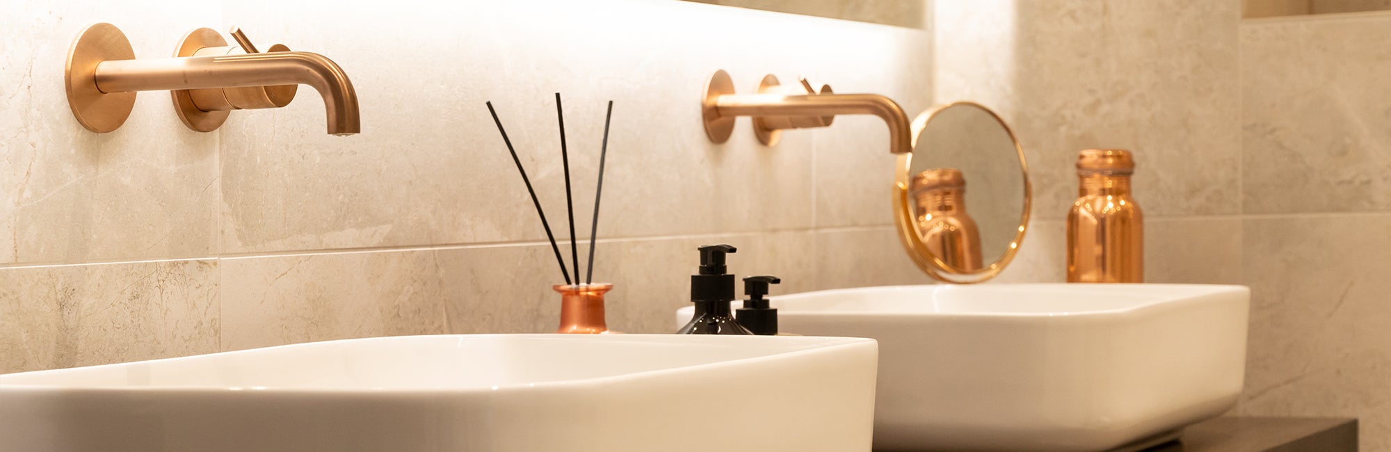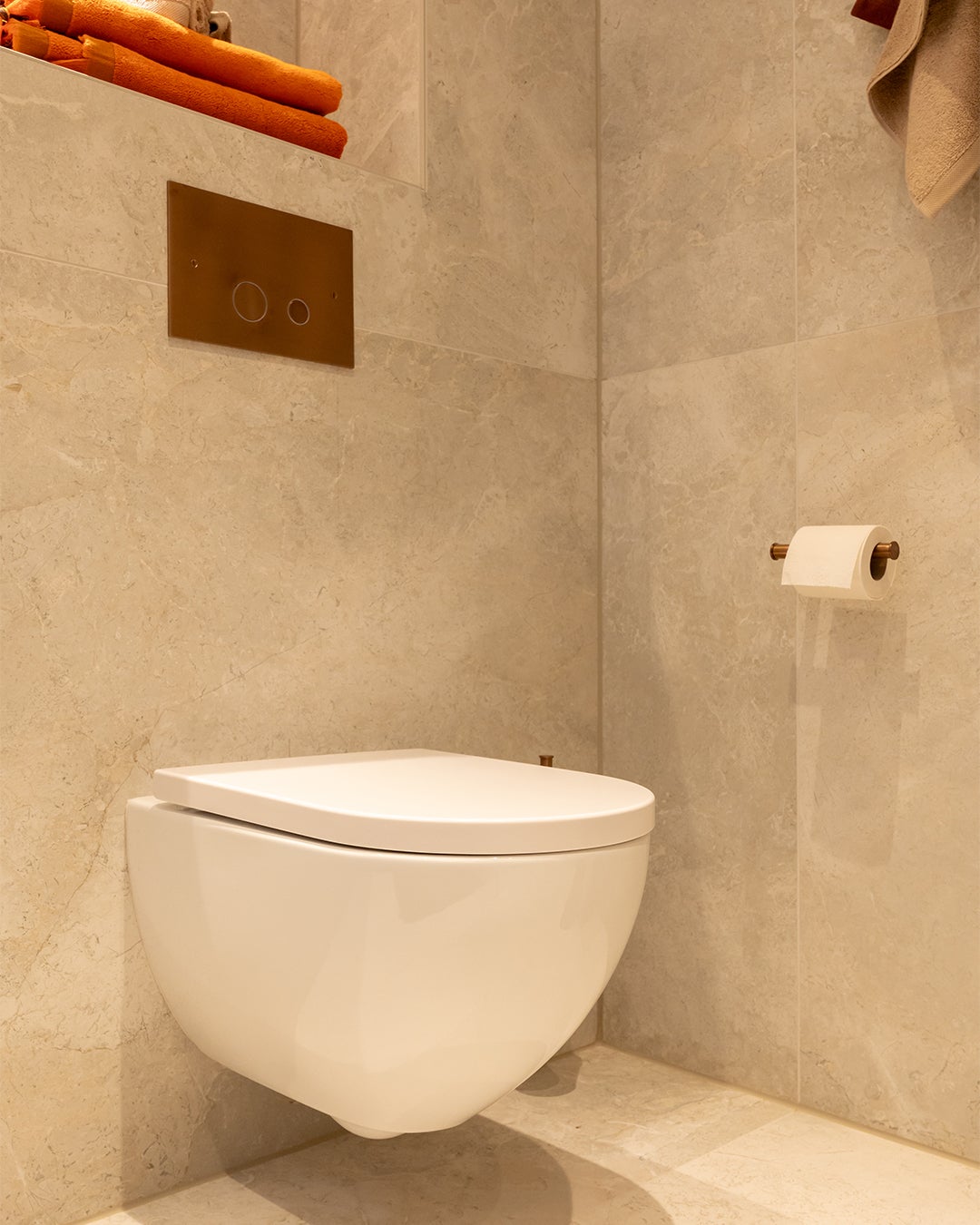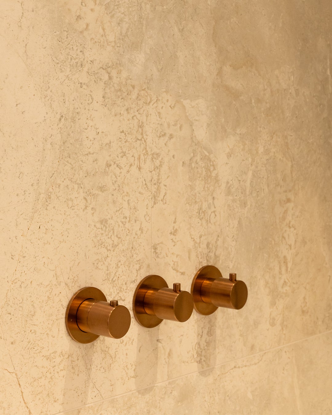 Deze warme tijdloze badkamer is voorzien van een inloopdouche, inbouwspotjes en een ruime nis om decoratie en handdoeken kwijt te kunnen. De opzetkommen op het donkere meubel en de koperen inbouwkranen zorgen samen met de inbouw regendouche voor een luxe en comfortabele wellness ervaring.