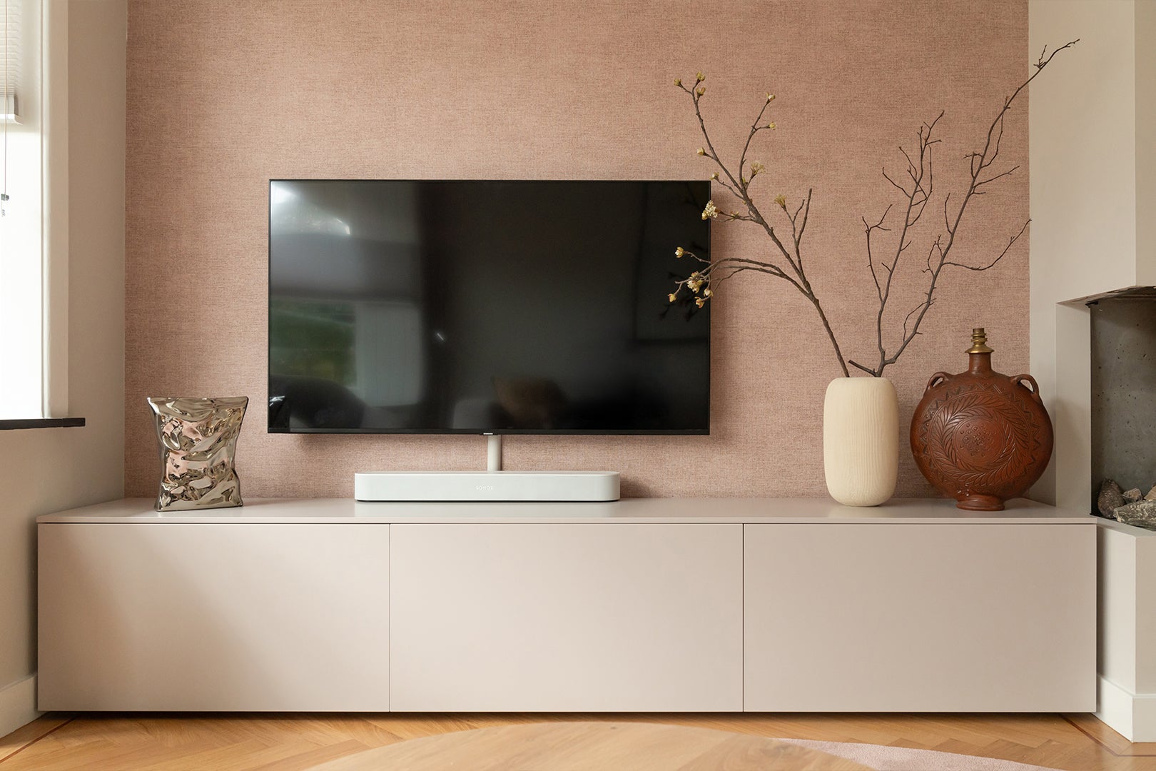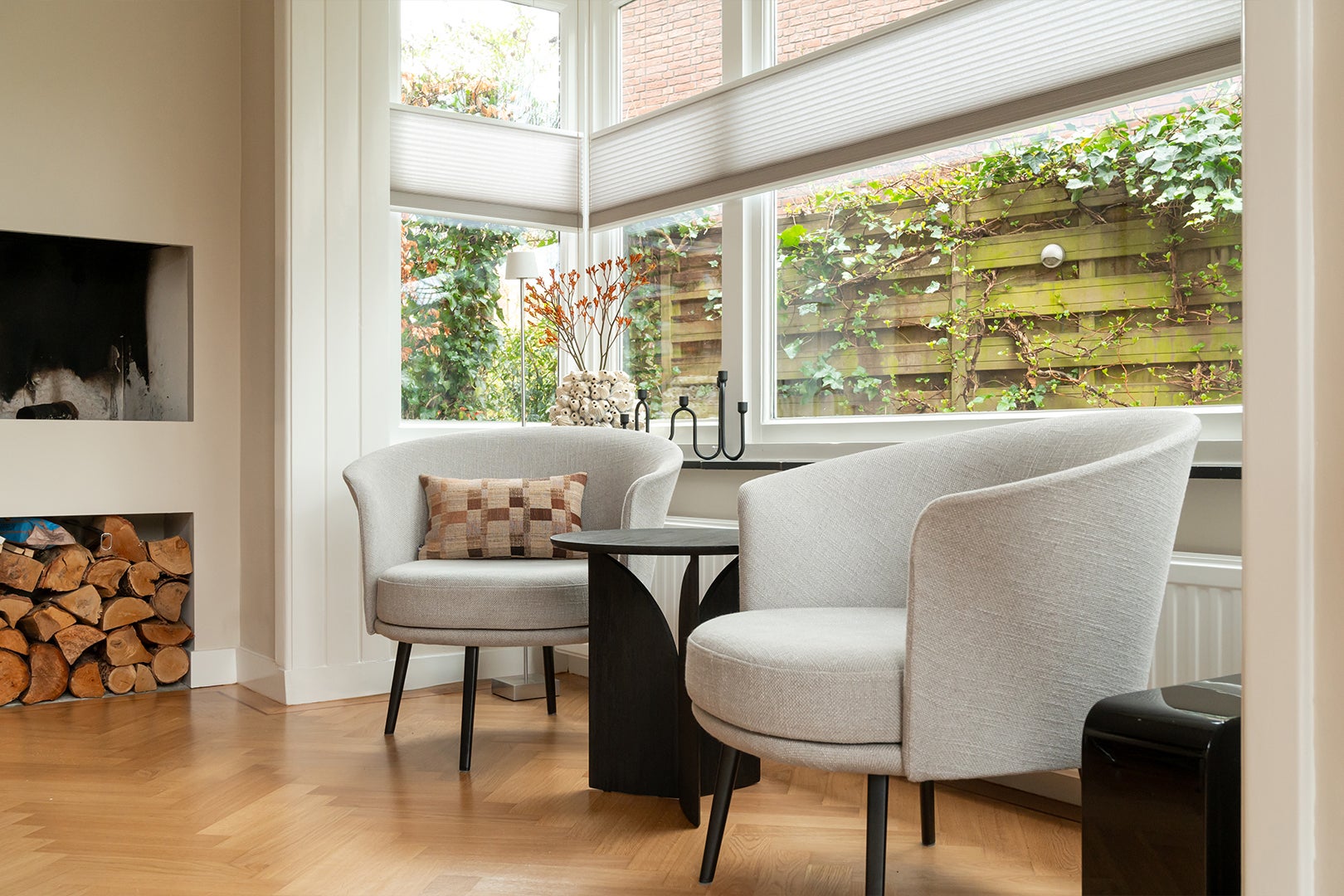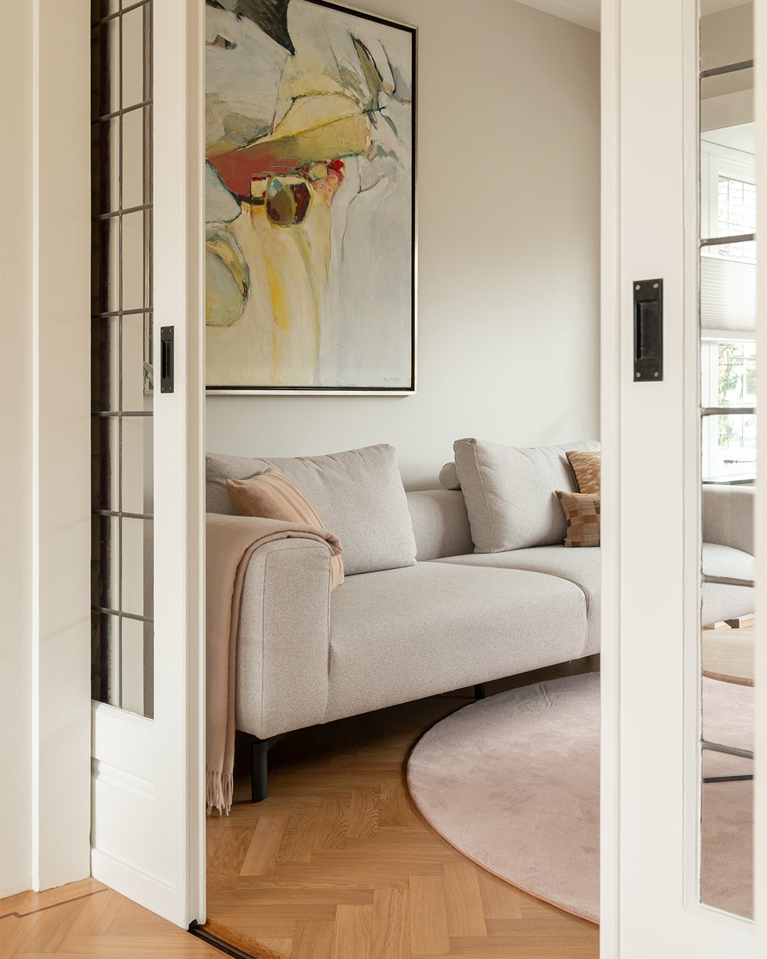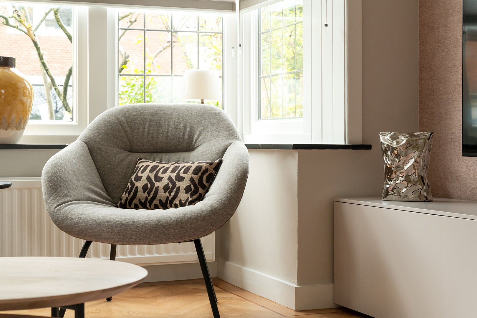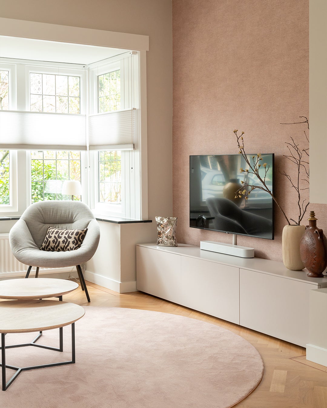 De bank van Jamé, HAY fauteuils, het Novamobili tv-meubel en het ronde kleed van Bekenkamp maken een comfortabele zithoek. De ronde HAY stoelen in de erker breken de strakke lijnen.