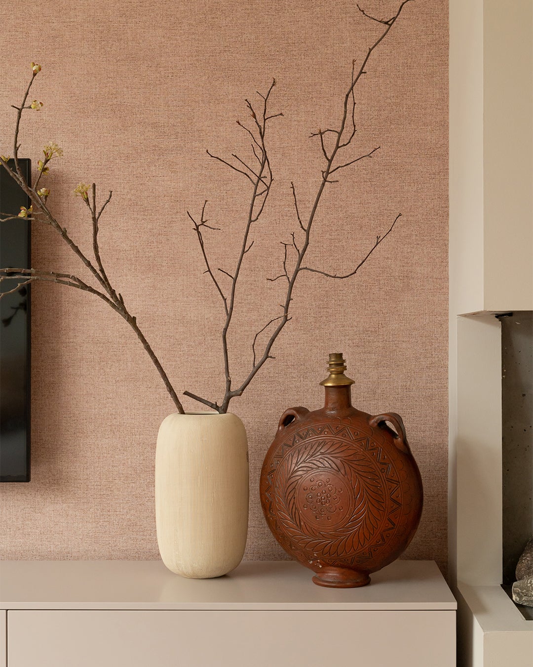 De voorkamer straalt nu rust uit door toepassing van de kleur Skimming Stone van Farrow & Ball en prachtig Eijffinger behang.