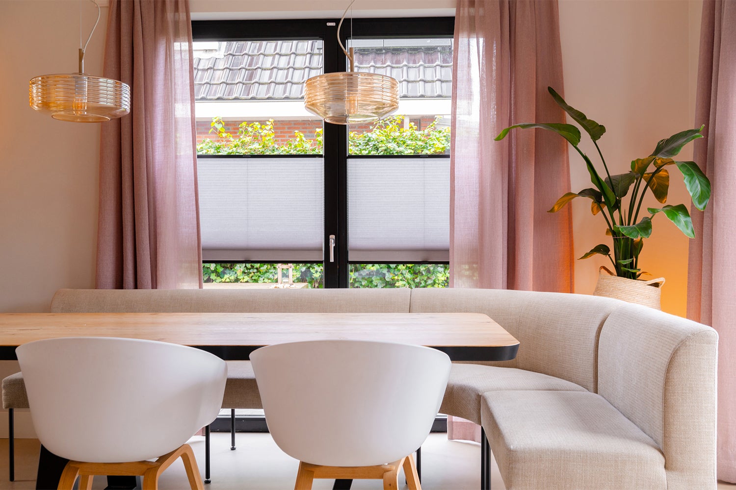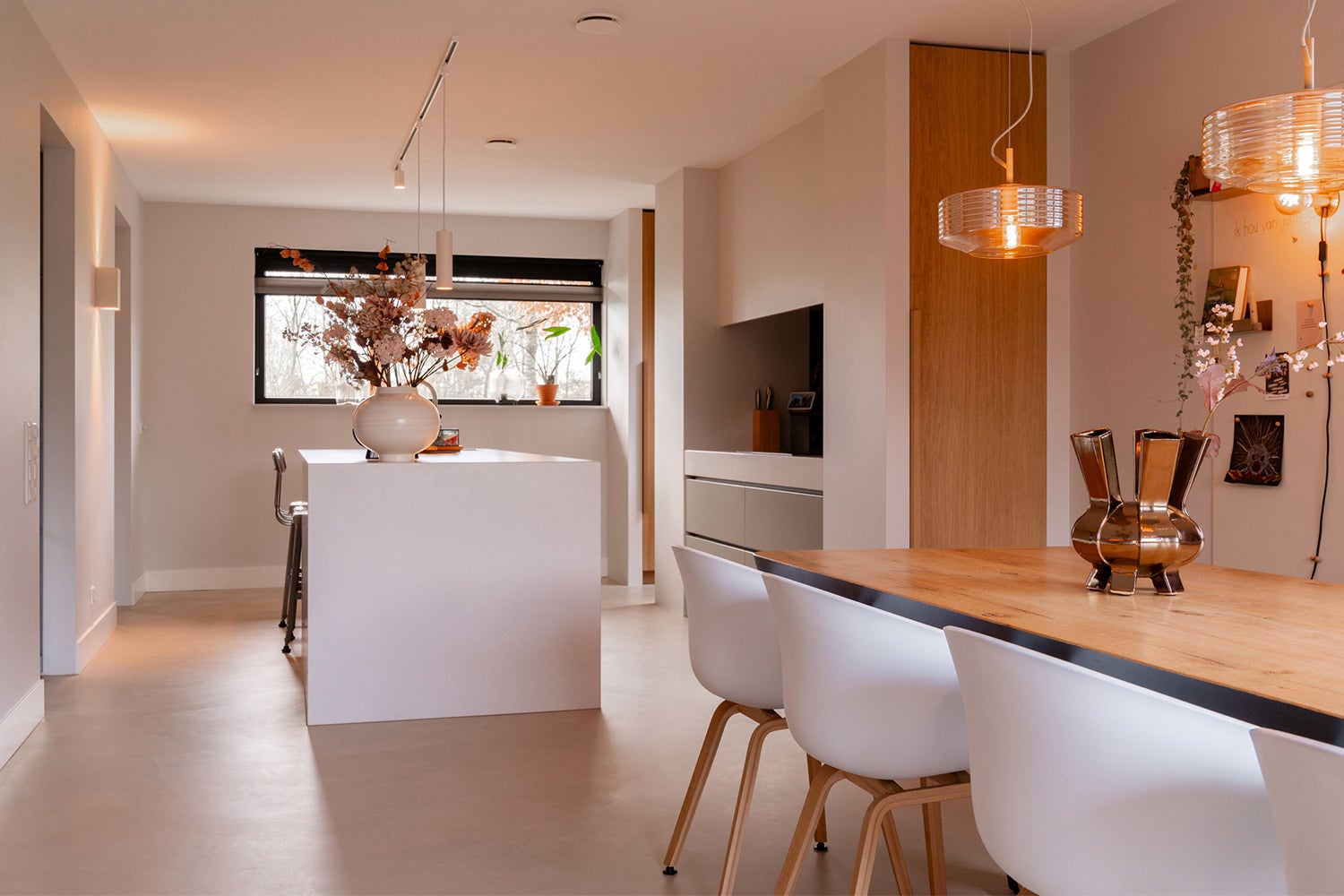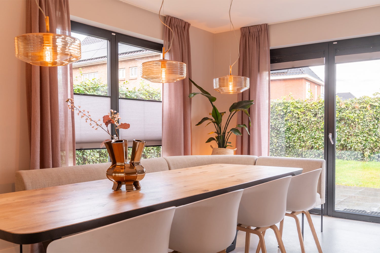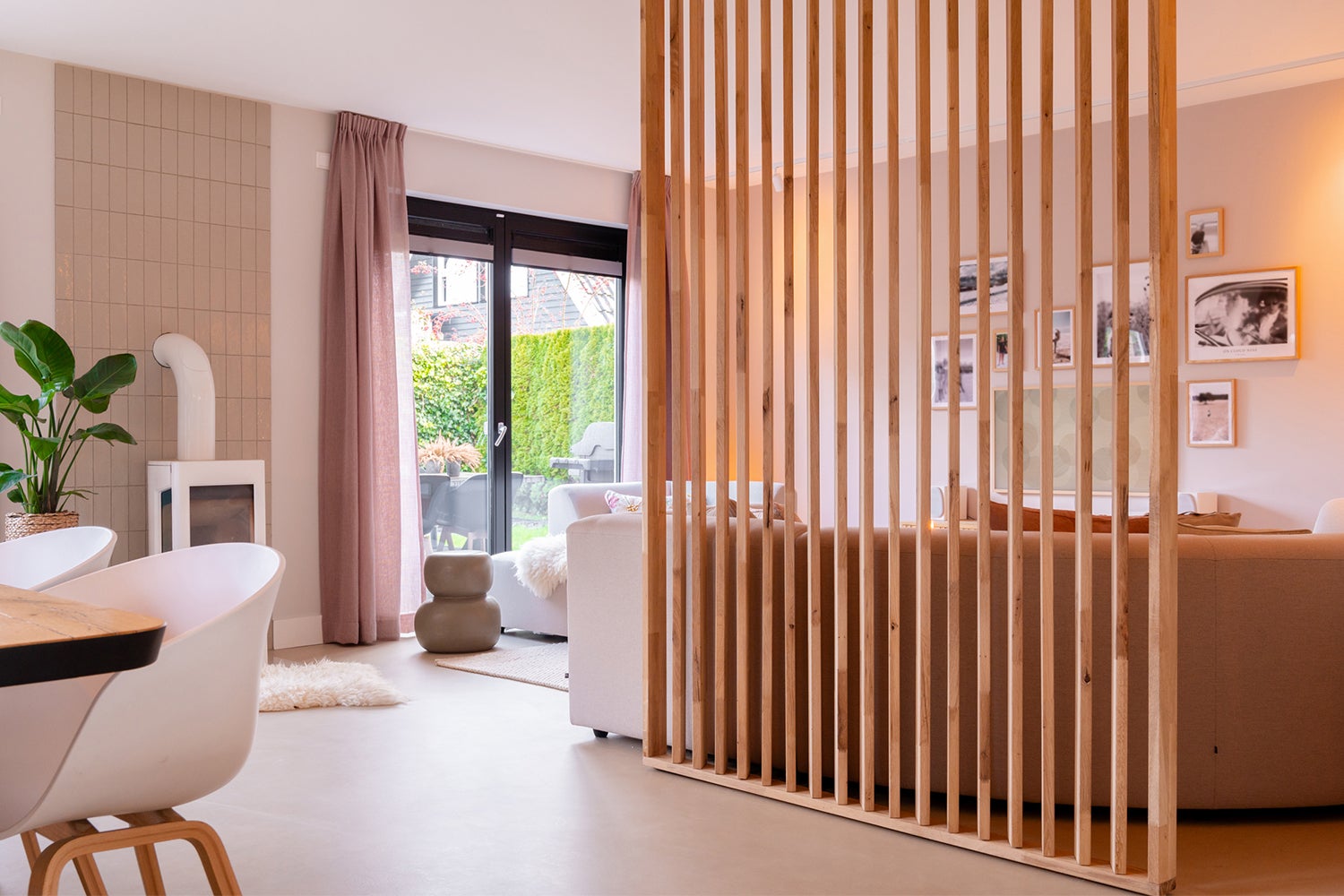 Om de ruimte tussen de zithoek en de eethoek optisch te scheiden, is gekozen voor een houten roomdivider. Deze divider met draaibare latten is gemaakt door onze meubelmakers, gewoon hier in onze meubelmakerij.