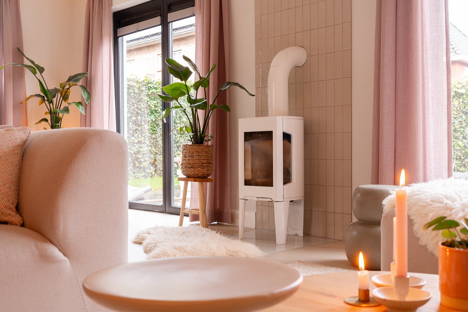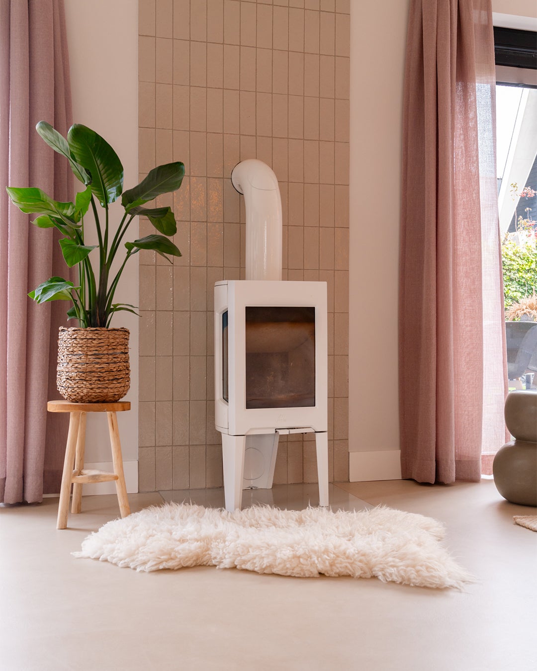 Ook de haard heeft een totale make-over gekregen met een nieuwe witte kachel en de unieke toepassing van een mooie Ragno glans tegel.