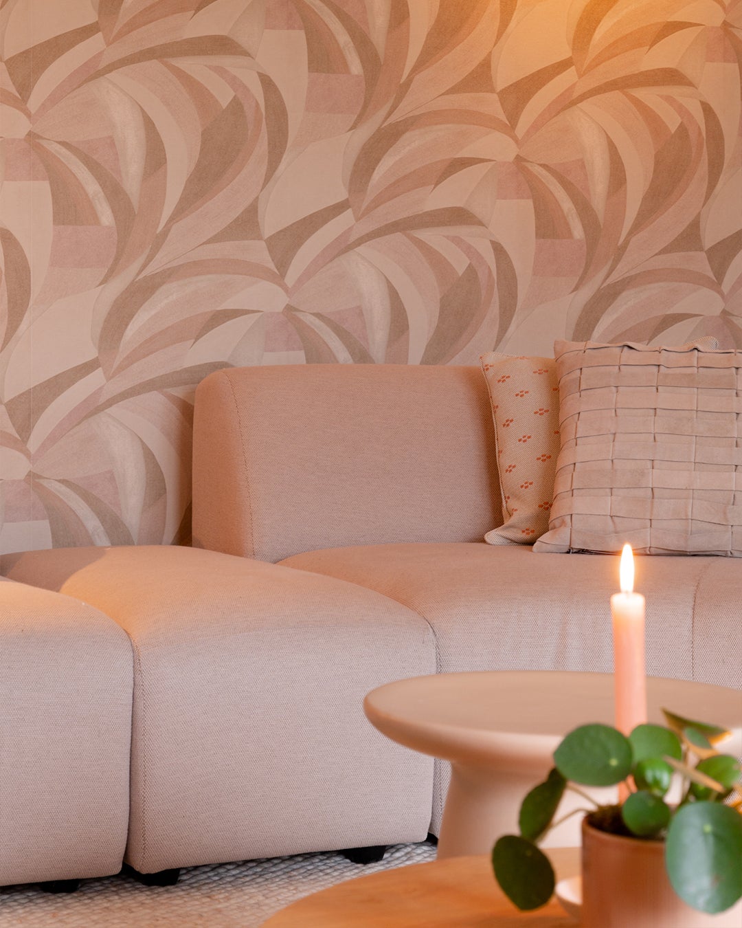 Het behang van HookedOnWalls uit de Aquarel serie brengt de kleuren van de keuken, wanden en raamdecoratie mooi bij elkaar. Voor de overige wanden zijn de keuren Calm en Chalk White van Pure & Original gekozen.