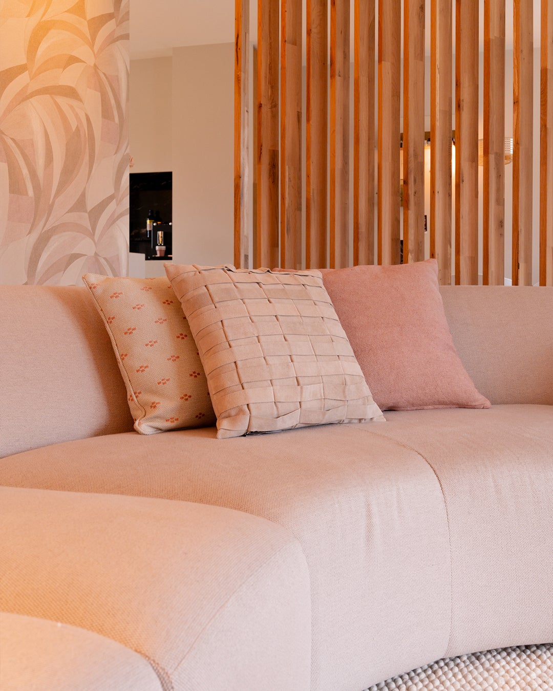 De modulaire JAX bank van HKLIVING creëert met de vloeiende ronding een knusse zithoek. Die ronding zie je ook terugkomen in de grote eetkamerbank, iets wat een grote wens was van de bewoners.