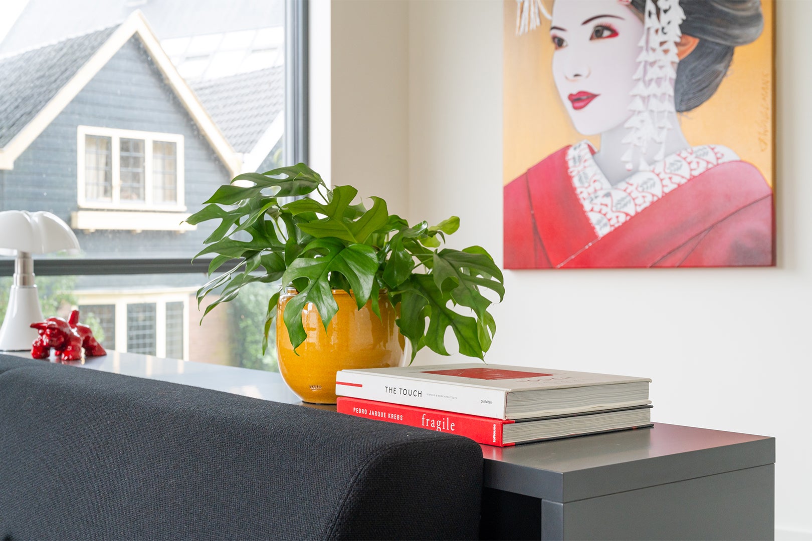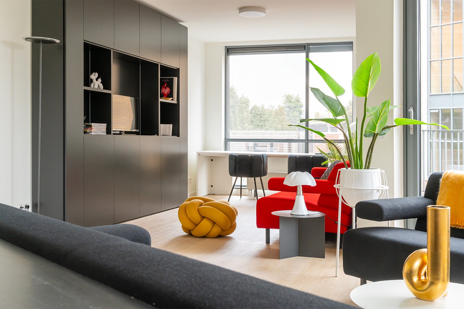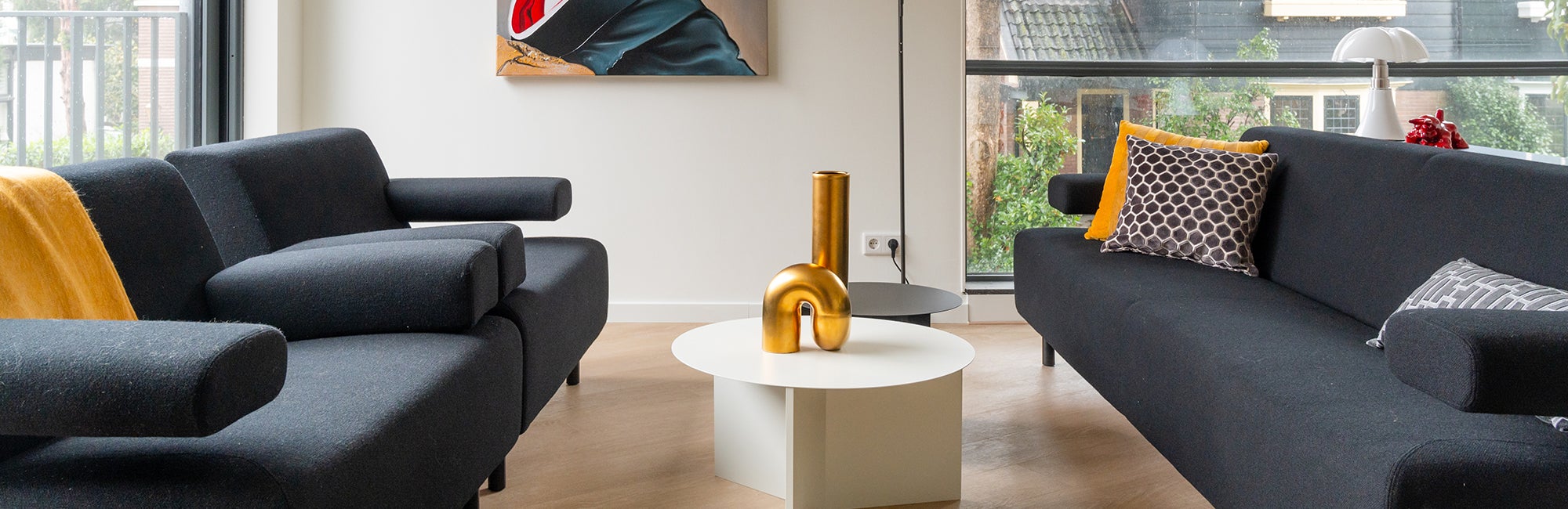 Hun smaak was heel duidelijk: strak en modern in de kleuren zwart, wit en rood. Design en kunst mochten niet ontbreken. We kozen voor designlampen, een eettafel van HAY en voor zitmeubels van Havee, voorzien van een De Ploeg stof. Het wandmeubel is van Nova Mobili. De schilderijen van Frank Wagtmans maken het geheel af tot een persoonlijk interieur.