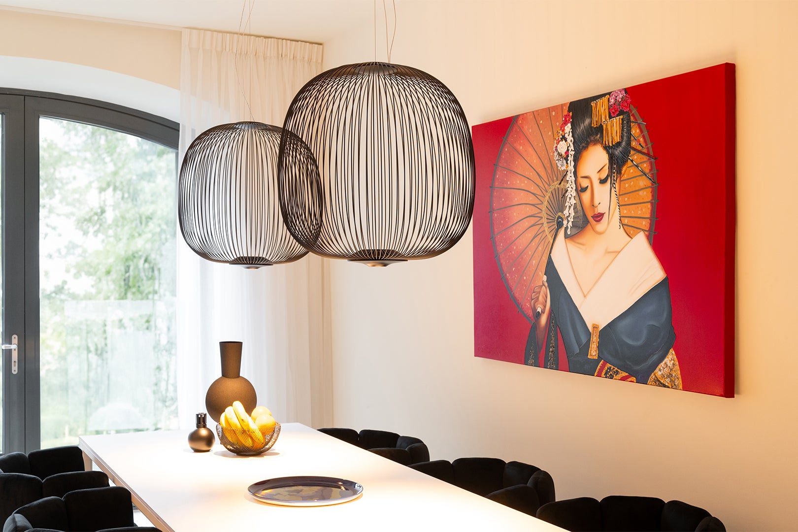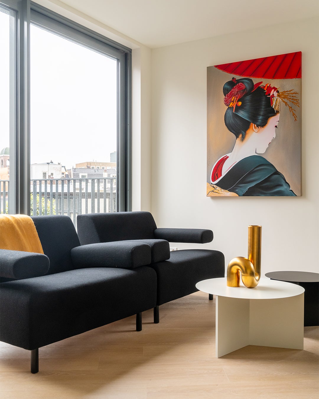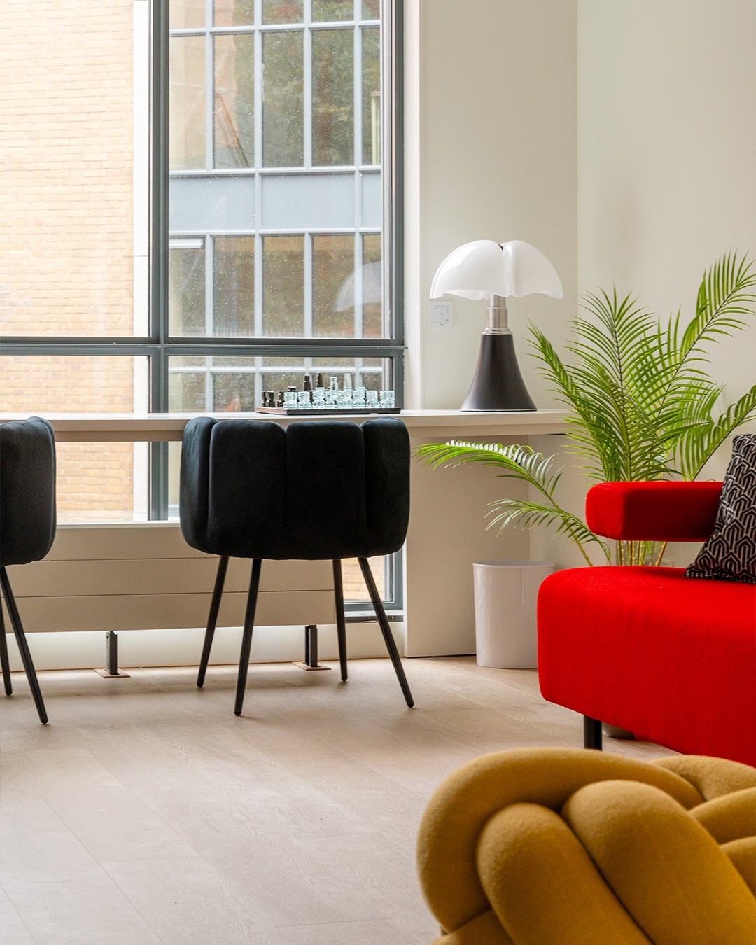 Hun smaak was heel duidelijk: strak en modern in de kleuren zwart, wit en rood. Design en kunst mochten niet ontbreken. We kozen voor designlampen, een eettafel van HAY en voor zitmeubels van Havee, voorzien van een De Ploeg stof. Het wandmeubel is van Nova Mobili. De schilderijen van Frank Wagtmans maken het geheel af tot een persoonlijk interieur.