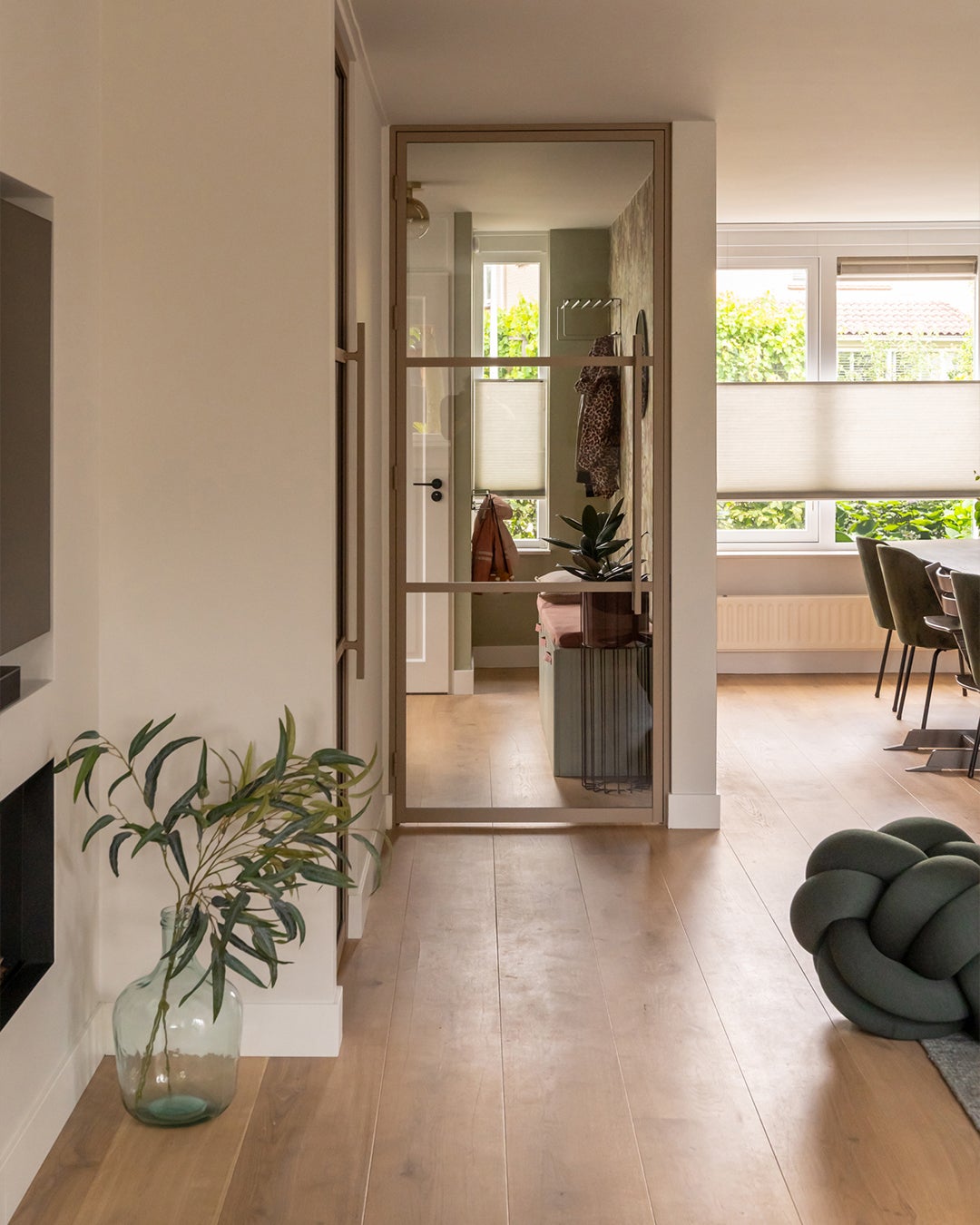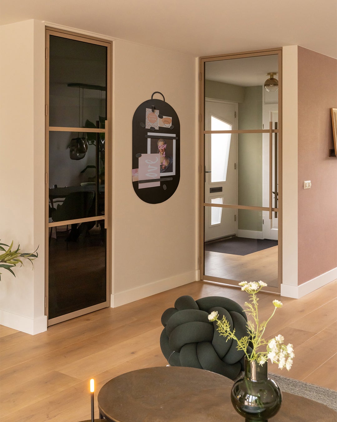 De prachtige metalen trapkast deur van Grand Metal Doors met donker glas zorgt ervoor dat al het speelgoed onzichtbaar kan worden opgeruimd. Het vervangen van de dichte haldeur voor zo’n zelfde deur met helder glas resulteerde in ruimtelijkheid en lichtinval.