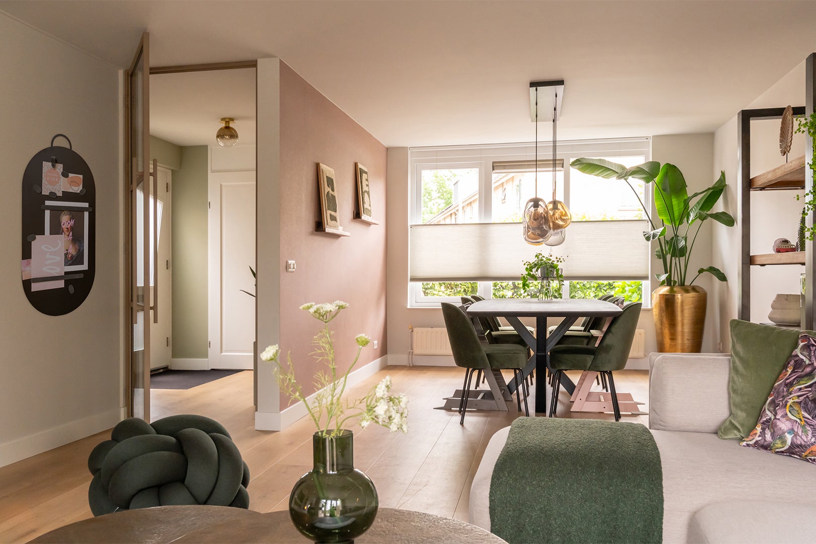 Onze meubelmakerij maakte voor de hal een opbergbankje op maat. Ook de eetkamertafel is maatwerk en werd gemaakt door onze houtkunstenaars. De vloer werd opgeknapt, een nieuwe keuken is geplaatst en in deze mooie basis zorgden subtiele kleurtinten van Farrow & Ball, vrolijk behang, een grote bank van FEST, eetkamerstoelen, fauteuil, vloerkleed, verlichting en accessoires voor de rest.