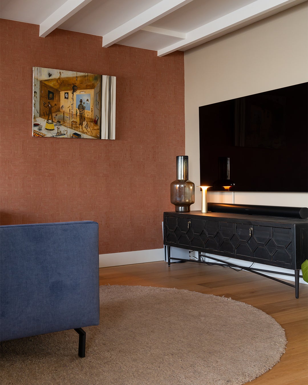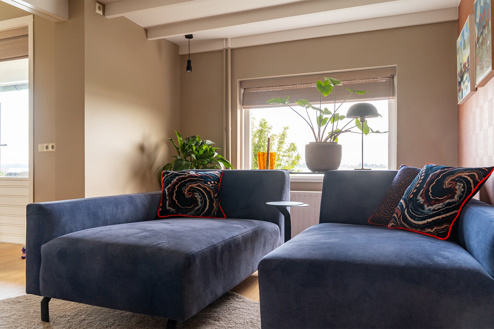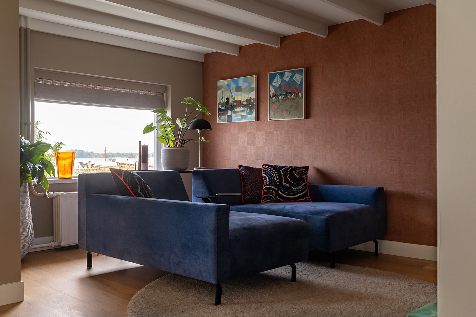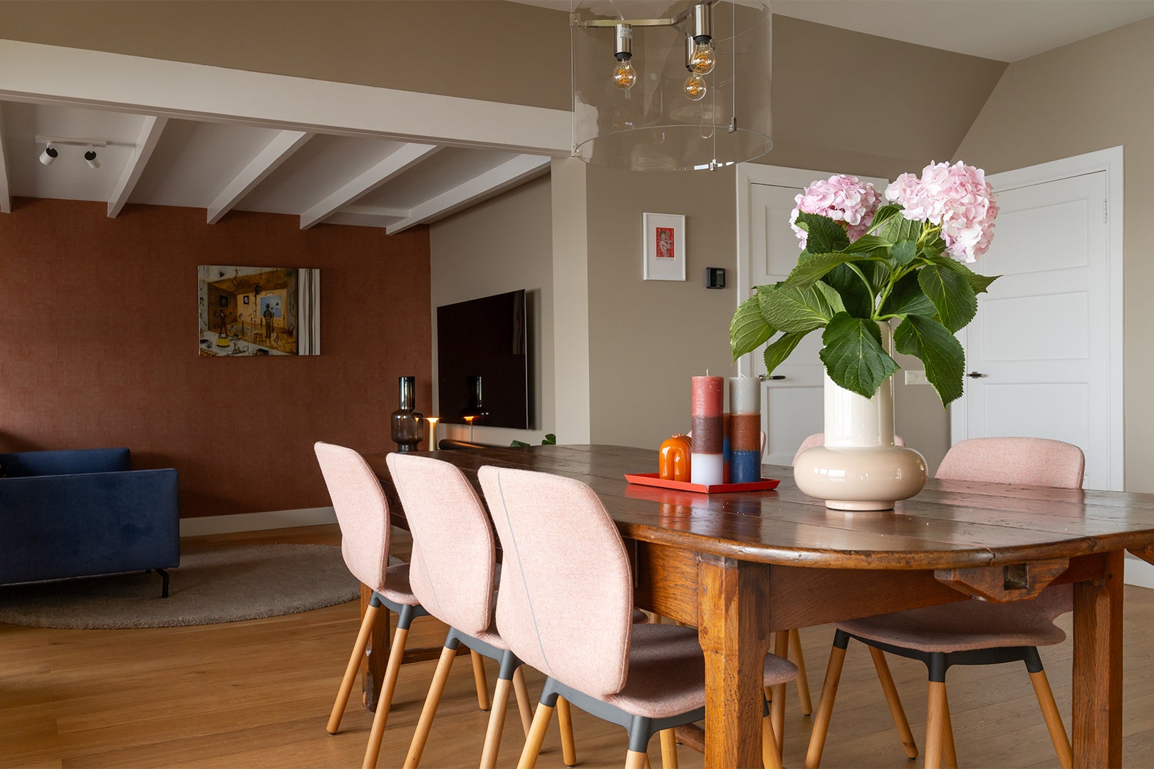 De wens van de klant was een kleurrijk en samenhangend interieur. Dit vonden zij zelf lastig te realiseren, omdat de woonkamer in diverse ruimtes is opgedeeld. Hun favoriete schilderijen en een lekkere lounge plek om samen ontspannen TV te kunnen kijken waren een must in hun woonkamer. Wij hebben meegedacht over de ideale indeling, verlichting, raamdecoratie, kleuren, behang en meubels. Het eindresultaat geeft een speels en harmonieus geheel.