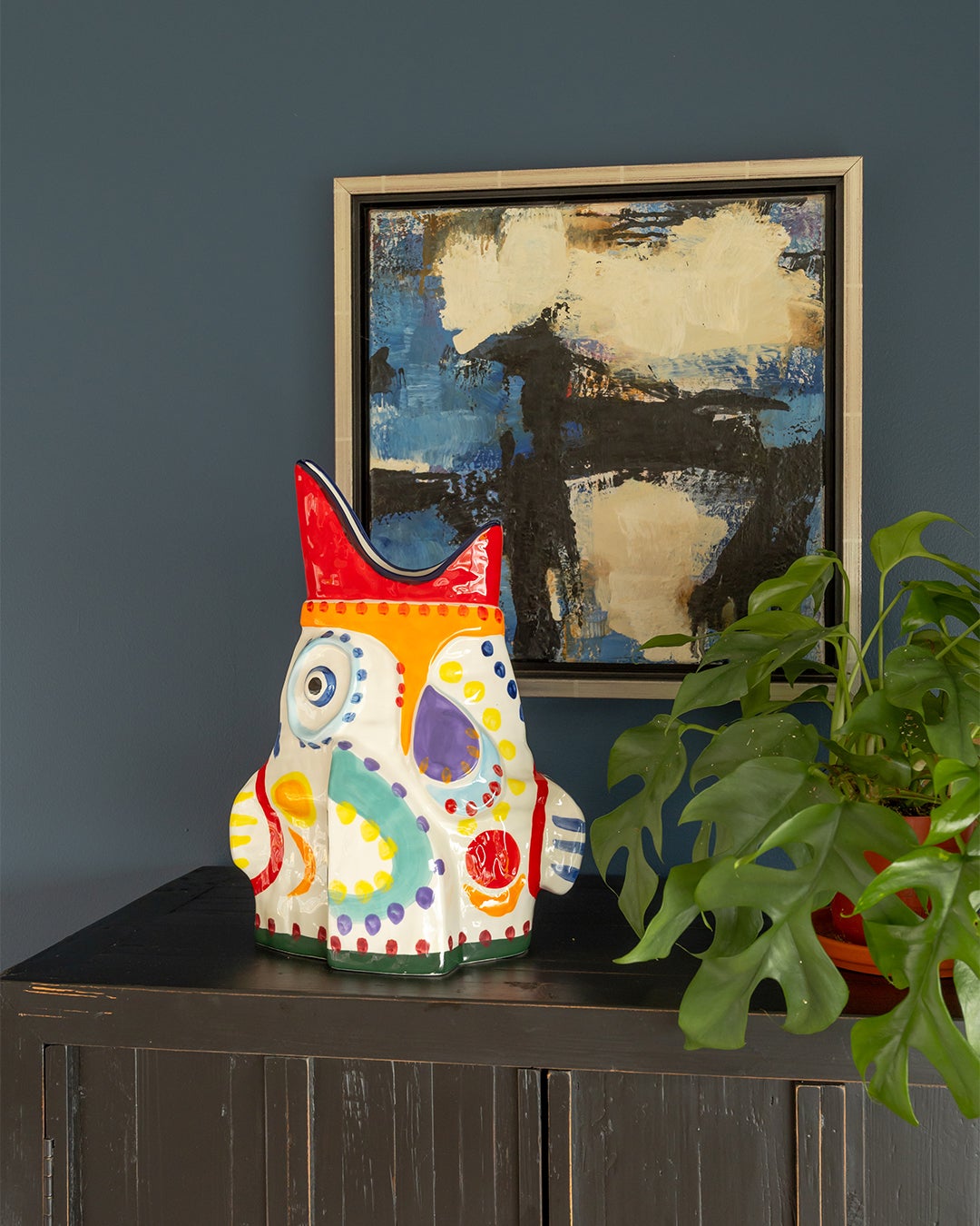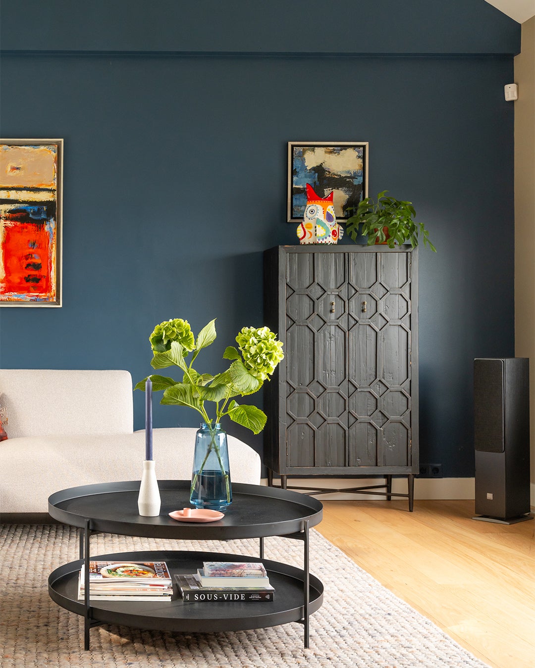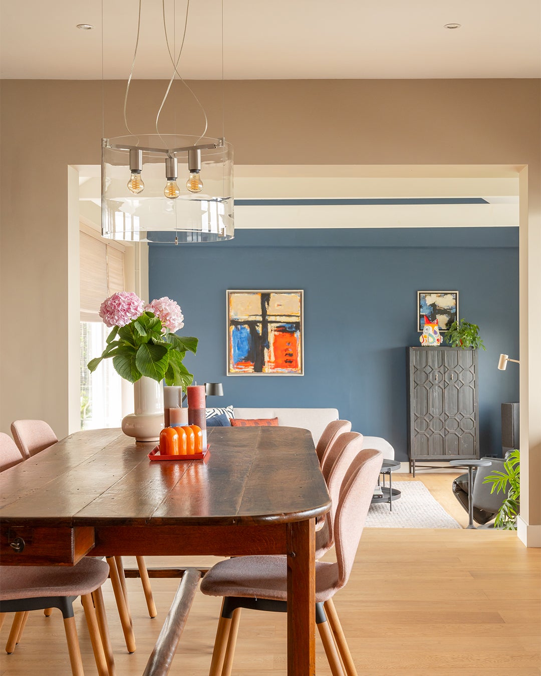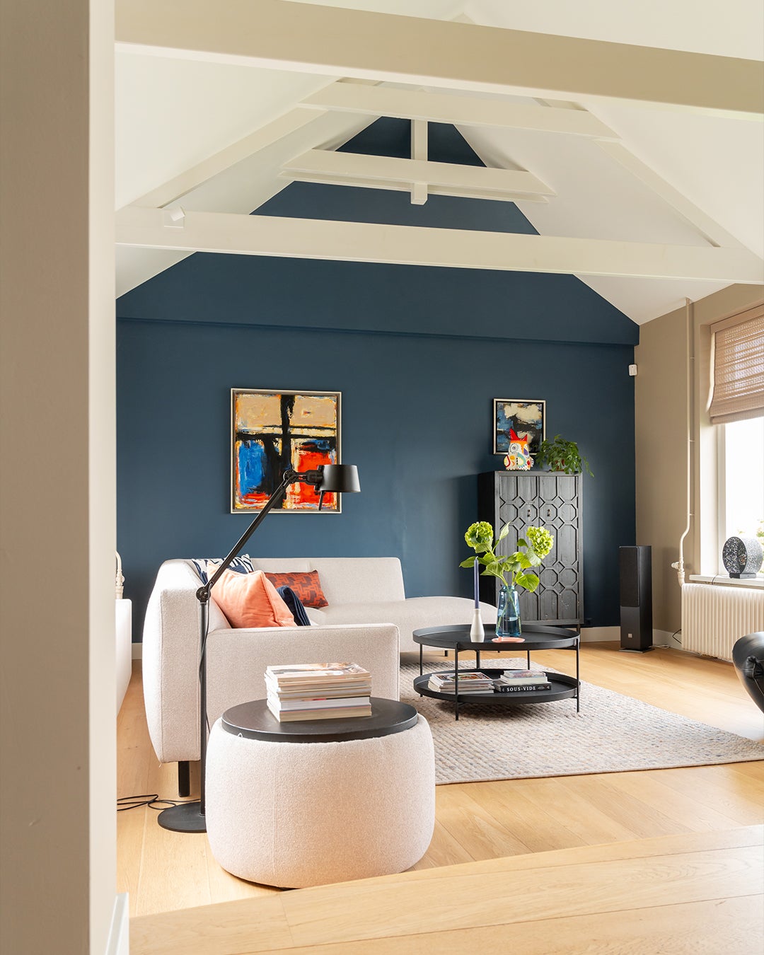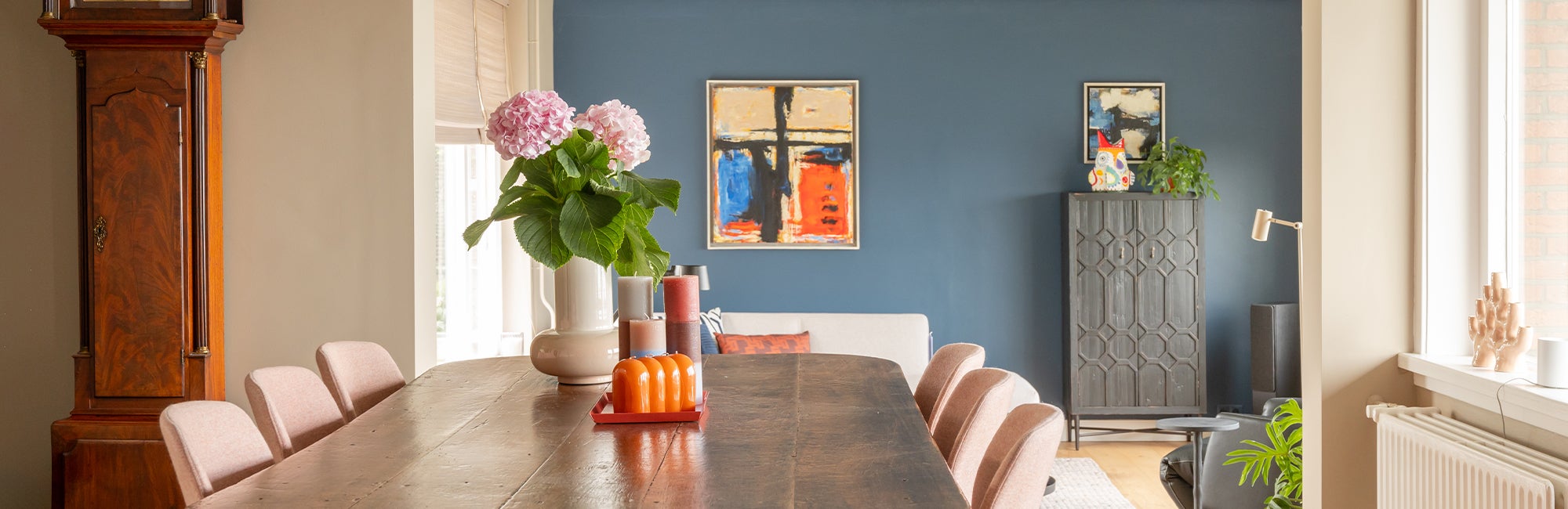 De wens van de klant was een kleurrijk en samenhangend interieur. Dit vonden zij zelf lastig te realiseren, omdat de woonkamer in diverse ruimtes is opgedeeld. Hun favoriete schilderijen en een lekkere lounge plek om samen ontspannen TV te kunnen kijken waren een must in hun woonkamer. Wij hebben meegedacht over de ideale indeling, verlichting, raamdecoratie, kleuren, behang en meubels. Het eindresultaat geeft een speels en harmonieus geheel.