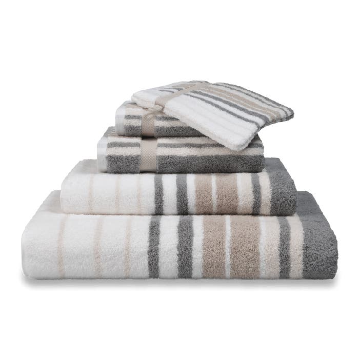 Ervaar luxe en comfort met de Ontario handdoeken, een stijlvolle en verantwoorde keuze voor je badkamer. Deze handdoeken vallen direct op door hun eigentijdse ontwerp: een speelse afwisseling van meerdere tinten in subtiele strepen, gecombineerd met fris wit. Een tijdloze look die moeiteloos past in zowel moderne als klassieke badkamers.
