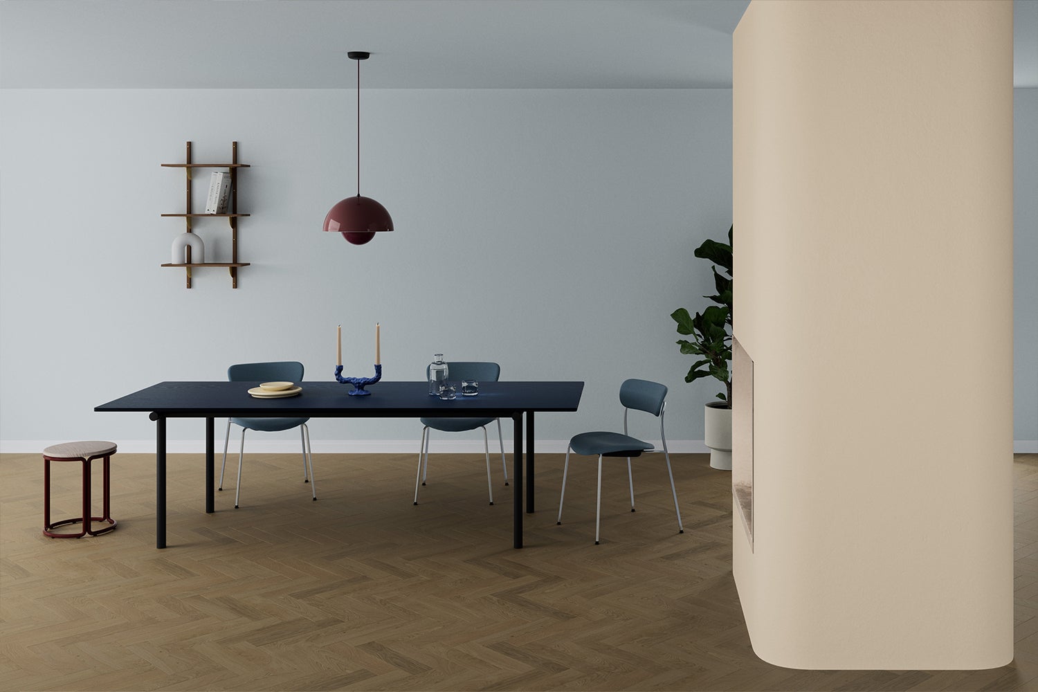 Met deze dromerige kleuren creëer je een zacht en harmonieus geheel: perfect voor een unieke, maar uitnodigende woonkamer. Met rijke blauwtonen en het donkere grijs is de link naar de kosmos duidelijk gemaakt. De lichtere tinten zijn koeler en zacht. Samen creëren de kleuren een contrast en maken ze het geheel tegelijkertijd harmonieus. En in combinatie met Amethyst Shadow als accentkleur, maak je een knipoog naar de kosmos.