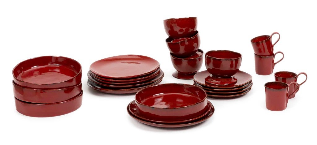 Het servies oogt een beetje nostalgisch, maar is in veel opzichten juist vernieuwend door het verticale ontwerp. Elke vorm is handgemaakt en dus uniek. Het servies is afgewerkt met glazuur in gebroken wit en een warm donkerbruin. Er is nog een derde kleur, onze favoriet: krachtig Venetiaans rood. Marie koos die kleuren ook bewust om een mix & match effect te creëren van wit, bruin en rood.