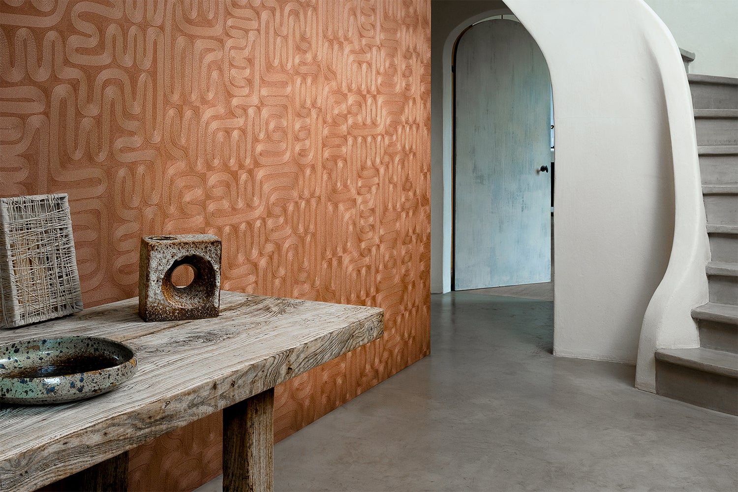 Behang Sarana van Arte combineert speelsheid met lichtheid en elegantie. Het luchtige patroon sluit perfect aan bij de organische textuur van het touw waarmee het gemaakt is. De subtiele variatie in touwdiktes voegt een dynamisch en levendig element toe, wat het dessin karakter en een unieke diepte geeft.