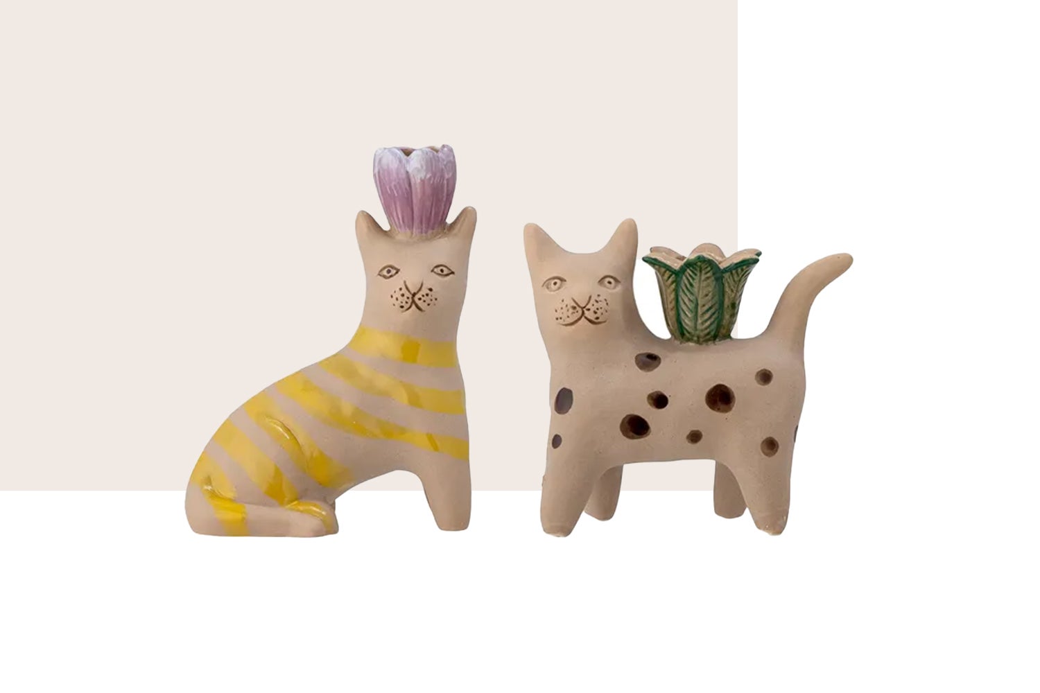 Voor de echte kattenliefhebbers onder ons. Deze tweedelige kaarsenstandaardset Mamie van het Deense designmerk Bloomingville is gemaakt van keramiek en vervolgens met de hand beschilderd. Dat levert een stipjeskat en een streepjeskat op. Bij elkaar best wel koppig, maar vooral onweerstaanbaar. En ja, het zijn typische huiskatten.