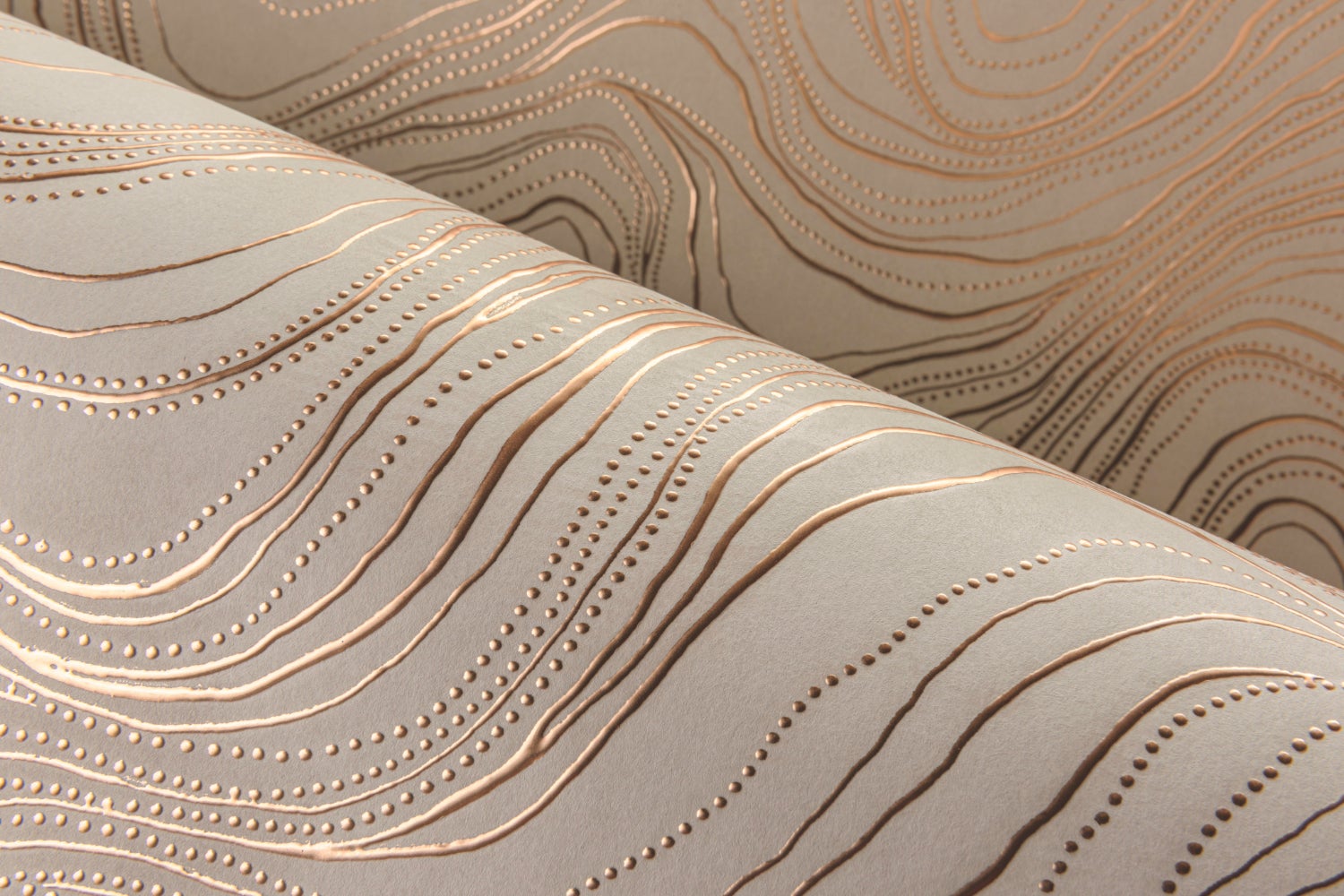 Behang Bayuda uit de collectie Kharga heeft de rotsige woestijn in Soedan als inspiratiebron. Het is de plek waar goudzoekers bezig zijn fortuin te vergaren tussen okerkleurige zandplaten.