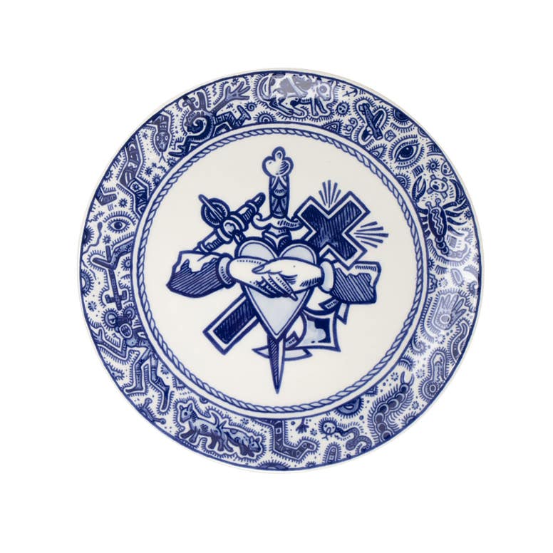 Inkt brengt samenhang. Het is gelaagd, diep geworteld en vormt een eerbetoon aan Delfts Blauw en de kunst van tatoeëren. Deze unieke samenwerking tussen twee traditionele ambachten uit de oude wereld is afkomstig uit het oosten. Rijk aan cultuur, traditie en symboliek, worden deze ambachten met de hand uitgevoerd. Of het nu gaat om het zetten van een naald in de huid of het schilderen met een penseel op aardewerk. Dit Delfts Blauwe bord staat symbool voor Geloof, Hoop en Liefde.