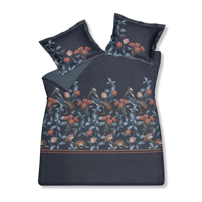 Het Vandyck dekbedovertrek Dark Flower heeft een print van rode bloemen en blauwe bladeren op een donkerblauwe ondergrond met een subtiel ruitmotief. De achterzijde is uni gekleurd.