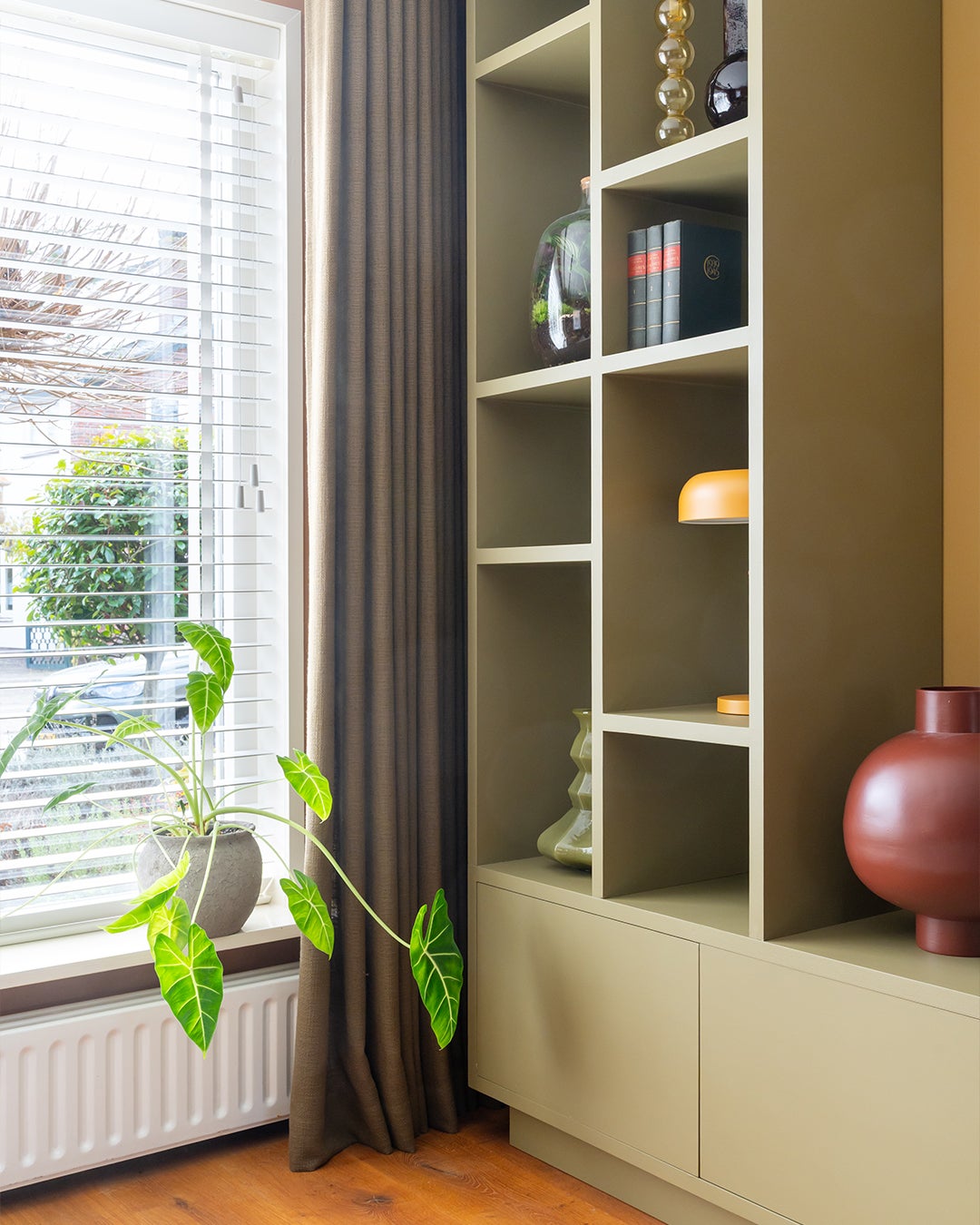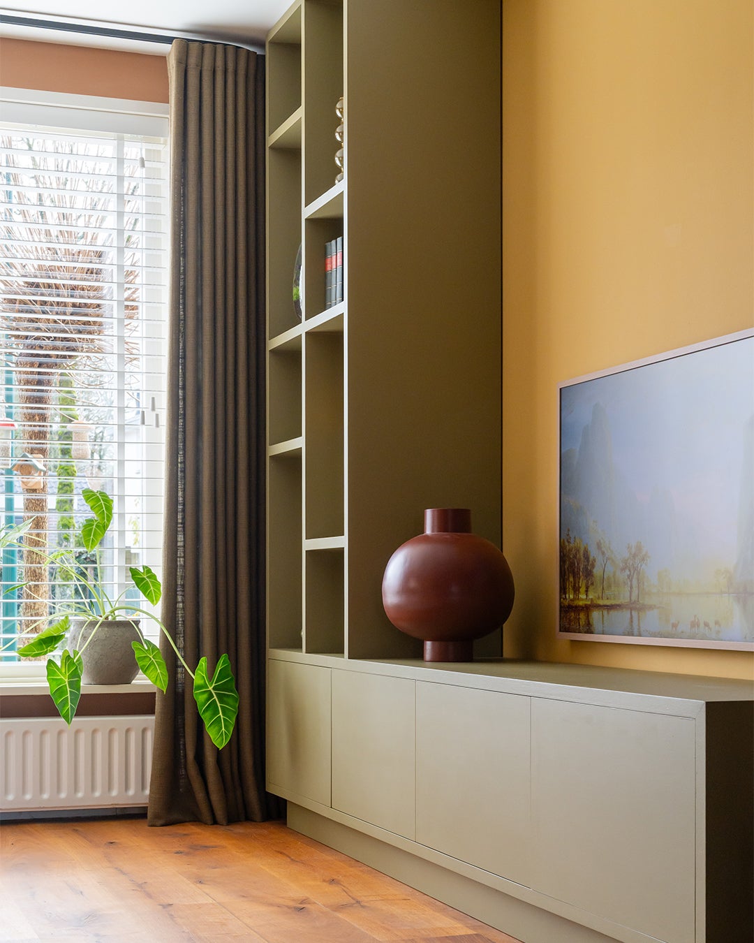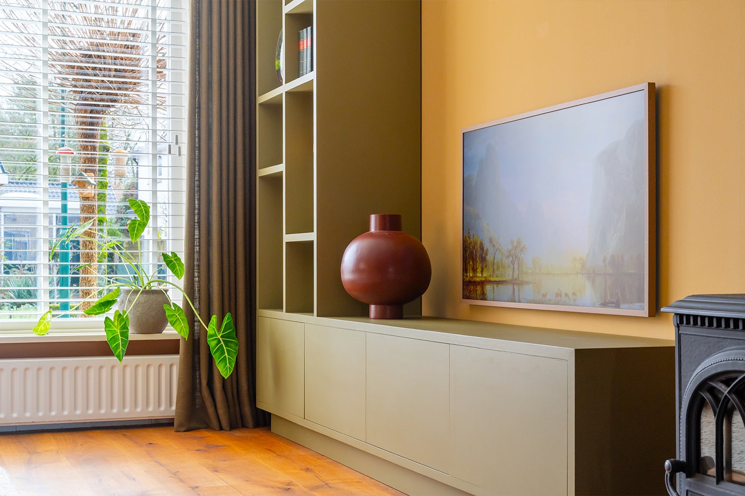 Een prachtig op maat gemaakt tv-meubel met genoeg opslag én plek voor een persoonlijke touch in de vorm van decoratie of boeken.
