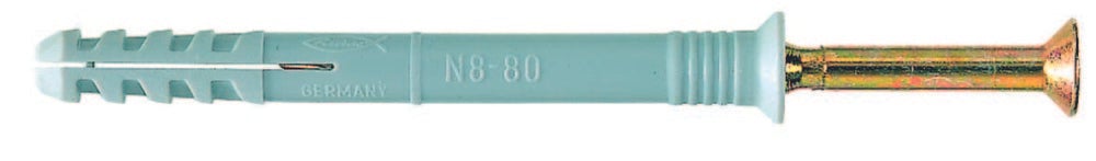 Nylon spijkerplug model n. Voor snel montagewerk in de afbouw. Voor massieve bouwstoffen en metselwerk. Compleet met voorgemonteerde schroef voorzien van kruiskop. In grootverpakking. De slagmontage maakt een snelle en economische seriemontage mogelijk. De geïntegreerde hamerbevestigingsstop voorkomt dat de plug voortijdig uitzet (vast zit).