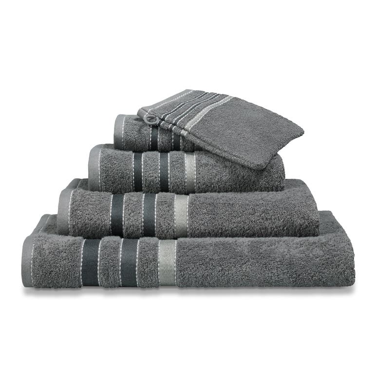 Prestige Lines mole grey handdoeken zijn grijs en hebben strepen in verschillende tinten grijs met wit stiksel. De Prestige Lines mole grey handdoeken van Vandyck hebben, door de glanzende strepen een stijlvolle uitstraling.