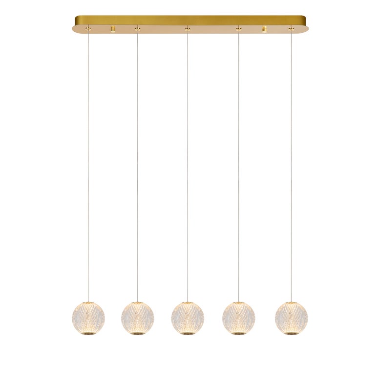 Laat je verleiden door de pendels van Cintra in 1 strakke lijn. De bolvormige lampenkapjes uit transparante acryl doen denken aan echt kristal door hun typerende groeven. Een heuse eyecatcher boven de eettafel of in je salon. Deze hanglamp is in hoogte verstelbaar en met een formaat van 11 x 11 x 9,8 centimeter passen de transparante lampenkapjes perfect in je ruimte. De messing details maken het plaatje compleet. Geniet van de geïntegreerde, dimbare ledlamp als extra troef van deze sprankelende lichtbron.