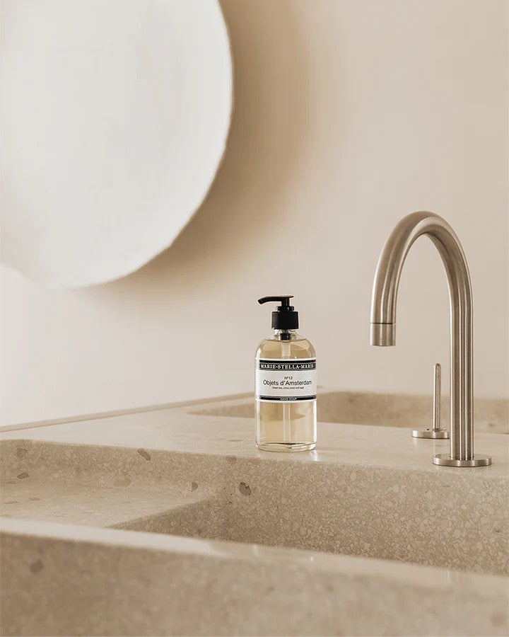 Was je handen in onze iconische Objets d'Amsterdam geur met deze reinigende en hydraterende hand soap. Door de natuurlijke ingrediënten zoals kokosglucoside en natuurlijke glycerine, zorgt de zeep ervoor dat je handen zacht, schoon en comfortabel aanvoelen. De hand zeep heeft een sprankelende geur, bestaande uit tonen van groene thee, citrus en salie die je de hele dag subtiel meedraagt.