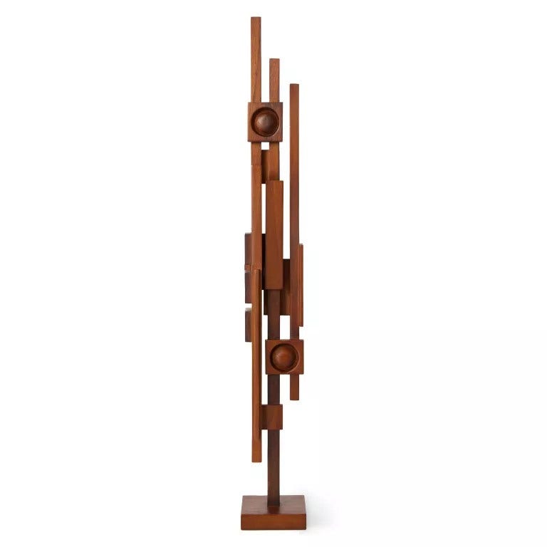 Met zijn brutalistische vorm en speelse compositie is dit ornament een opvallend accessoire geïnspireerd op de skylines van de stad. Verkrijgbaar in drie verschillende maten en varianten, allemaal gemaakt van teakhout
