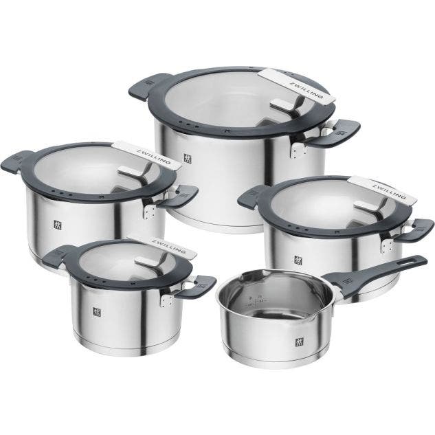 Dit is een moderne pannenset van het merk Zwilling. Een 5-delige pannenset met een handige maataanduiding aan de binnenzijde. Dankzij het glasdeksel heb je altijd zicht op het kookproces. De dikke 5 mm capsulebodem heeft 3 lagen, met een aluminium tussenlaag voor een optimale warmteverdeling. De pluspunten van deze pannenset hebben voornamelijk te maken met de innovatieve deksel.