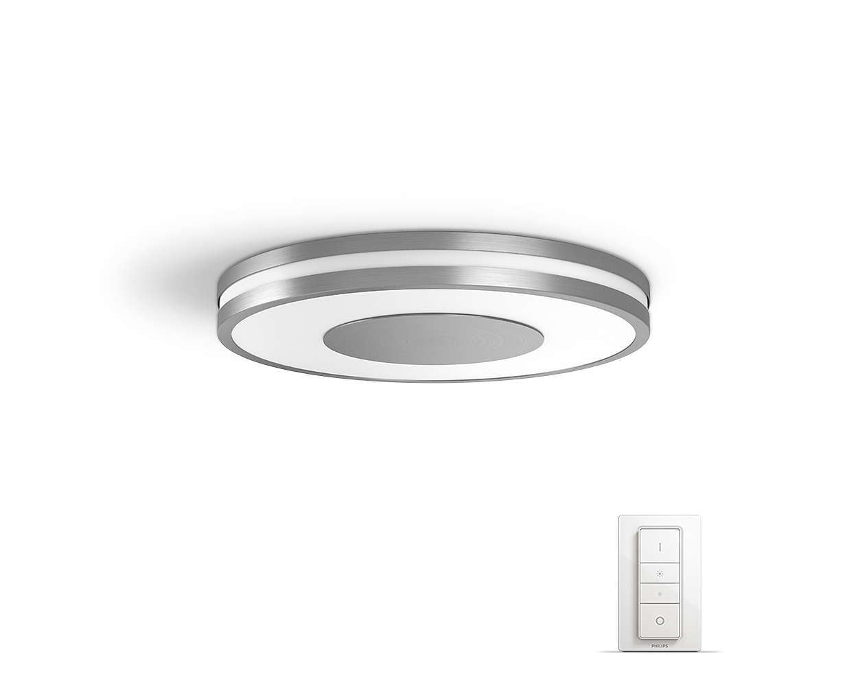De aluminiumkleurige Philips Hue Being White ambiance LED-plafondlamp is een aanwinst voor ieder interieur. Met het unieke ontwerp verlicht je niet alleen de kamer, maar creëer je ook een prachtig indirect lichteffect op het plafond. De lamp wordt geleverd compleet met een Philips Hue dimmer switch voor een gemakkelijke bediening: in- en uitschakelen, dimmen en vier verschillende lichtscènes. Gebruik de Hue app en stel het licht precies in zoals jij het wilt, zonder op te hoeven staan: koelwit licht om te concentreren, warmwit licht om zachtjes te ontwaken, te lezen of te ontspannen. Als je de plafondlamp verbindt met de Hue Bridge geniet je van allerlei extra slimme verlichtingsmogelijkheden zoals het personaliseren van lichtscènes, het instellen van timers en nog veel meer.Bedien tot wel 10 lampen direct via Bluetooth