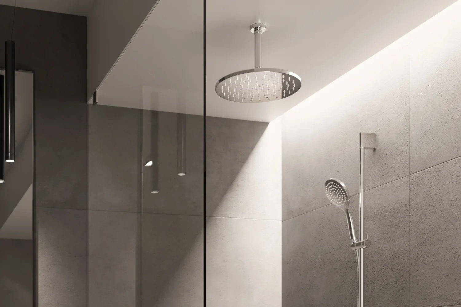 Net als bij douchekranen heb je bij een douchekop de keuze voor inbouw of opbouw. Met een ingebouwde douchekop creëer je een strakke look voor je badkamer. Hierbij wordt de kop in het plafond gebouwd, vooral prachtig als je een regendouche hebt, maar ook een handdouche kun je fraai in de muur verwerken. Zo’n inbouwoptie is natuurlijk heel mooi, maar het heeft nog een groot voordeel: je bent namelijk vrij in de plaatsing van de kraan in verhouding tot de douchekop. De leidingen lopen tenslotte door de muur. Zo kun je bijvoorbeeld de knoppen bij de ingang van de douchecabine plaatsen, terwijl de douchekop keurig achter in de cabine hangt.