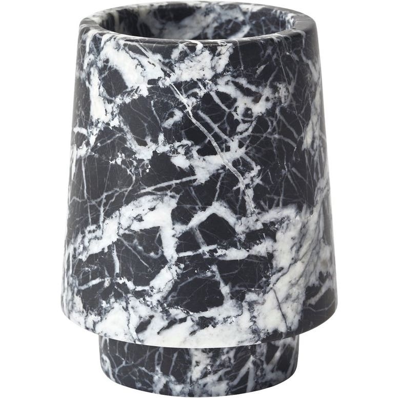 De kenmerkende vorm met een schuin toelopend silhouet en smalle voet geeft de houder een modern en elegant karakter. Door de natuurlijke marmering is elk exemplaar uniek, wat bijdraagt aan een exclusieve uitstraling. Deze tandenborstelhouder is perfect te combineren met andere producten uit de Orion-serie voor een harmonieus geheel.