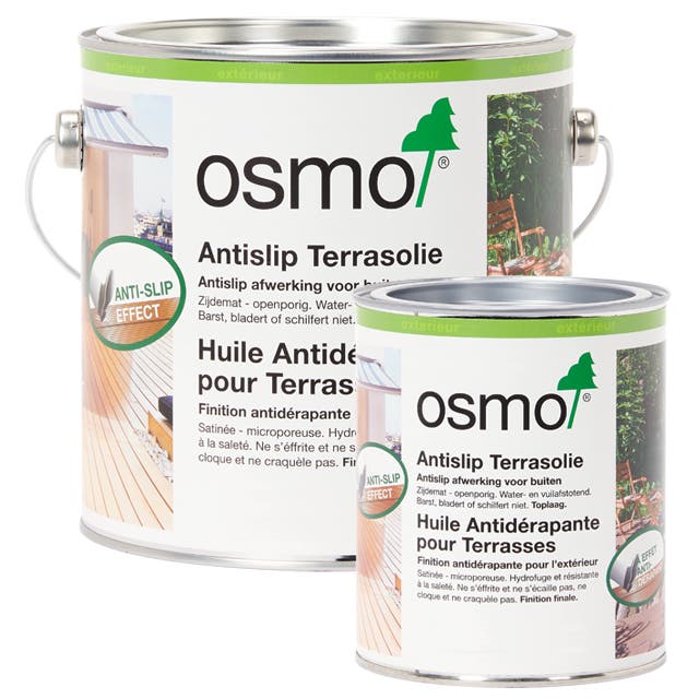 Vlonderplanken glad Wanneer een vlonder, terras of buitentrap is behandeld met de Osmo Terras-Olie kan er na aanraking met water een glad oppervlak ontstaan. Om dit probleem te verhelpen kan het oppervlak behandeld worden met de Anti-Slip Coating. Na behandeling met het product ontstaat er een Anti-Slip oppervlak waardoor gladde oppervlakken zoals trappen en houten terrassen niet meer glad zijn.