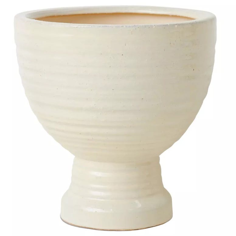 Wat deze plantenbak echt bijzonder maakt, is de gebogen vorm die is verrijkt met organische, geribbelde lijnen. Deze lijnen geven het object een levendige uitstraling die doet denken aan natuurlijke elementen zoals golvend zand of stromend water. Ondanks zijn volumineuze aanwezigheid, weet de plantenbak een gevoel van luchtigheid te behouden door de sierlijk smalle voet waarop hij balanceert. Deze subtiele basis creëert een gevoel van gewichtloosheid en dynamiek, waardoor het ontwerp een harmonieuze balans tussen zwaarte en lichtheid bereikt.