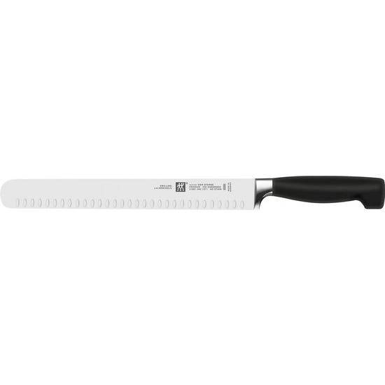 Maak kennis met het ultieme snijgereedschap voor de veeleisende thuiskok en professionele chef: het ZWILLING Four Star vleesmes met kuiltjes, 26 cm. Dit hoogwaardige mes is ontworpen om moeiteloos en nauwkeurig te snijden, of het nu gaat om flinterdunne plakjes carpaccio, malse stukken zalm of een luchtige cake. Elk detail is gericht op comfort, precisie en hygiëne.